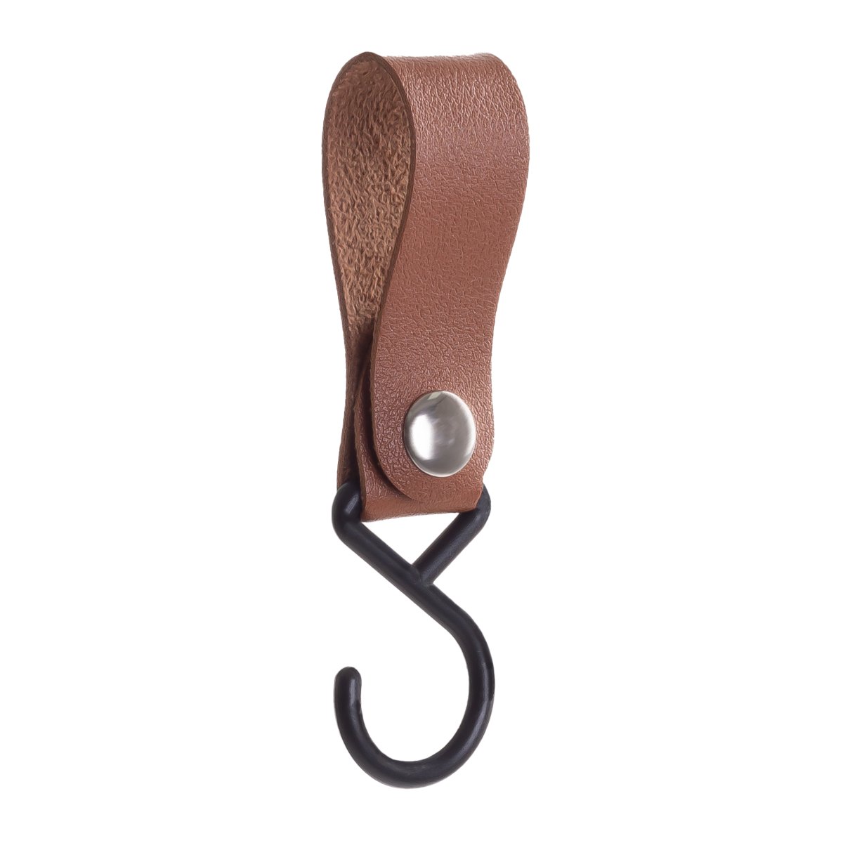 Aan het leren bandje van deze haak zit een drukknoop bevestigd. Met deze drukknoop is het mogelijk om het bandje te openen en te sluiten. Zo kun je het haakje eenvoudig ergens ophangen. Ook als je het op een later moment toch ergens anders wilt gebruiken, is dat geen enkel probleem. Open het bandje en hang het op een andere plek weer op. Wel zo praktisch.