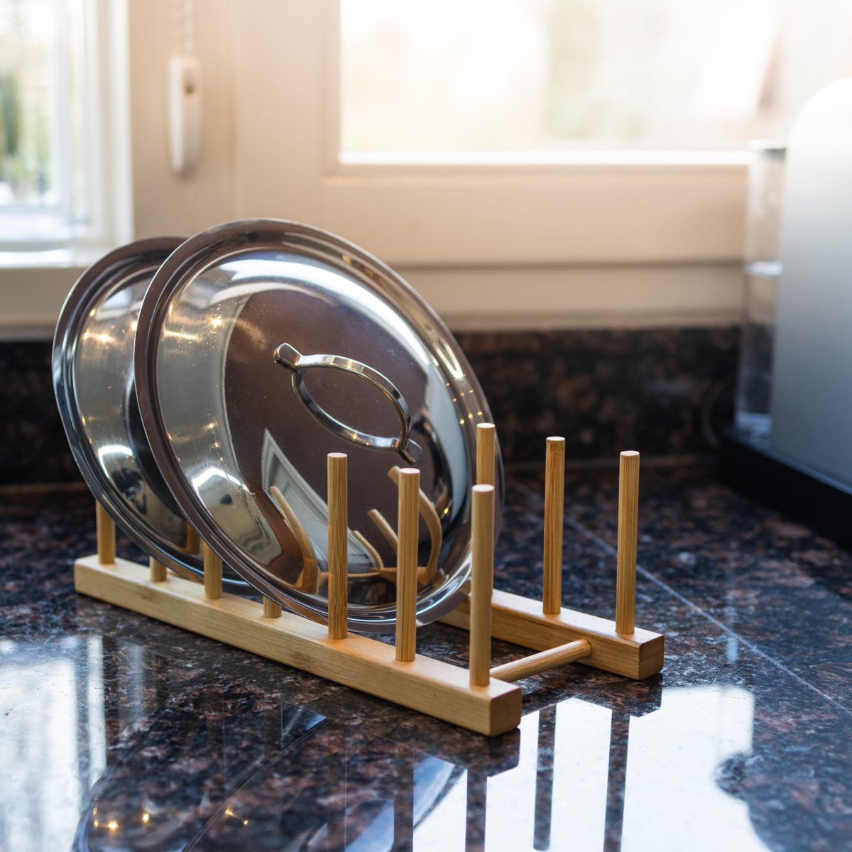 Een stijlvolle en praktische pannendekselhouder van bamboe voor 6 deksels