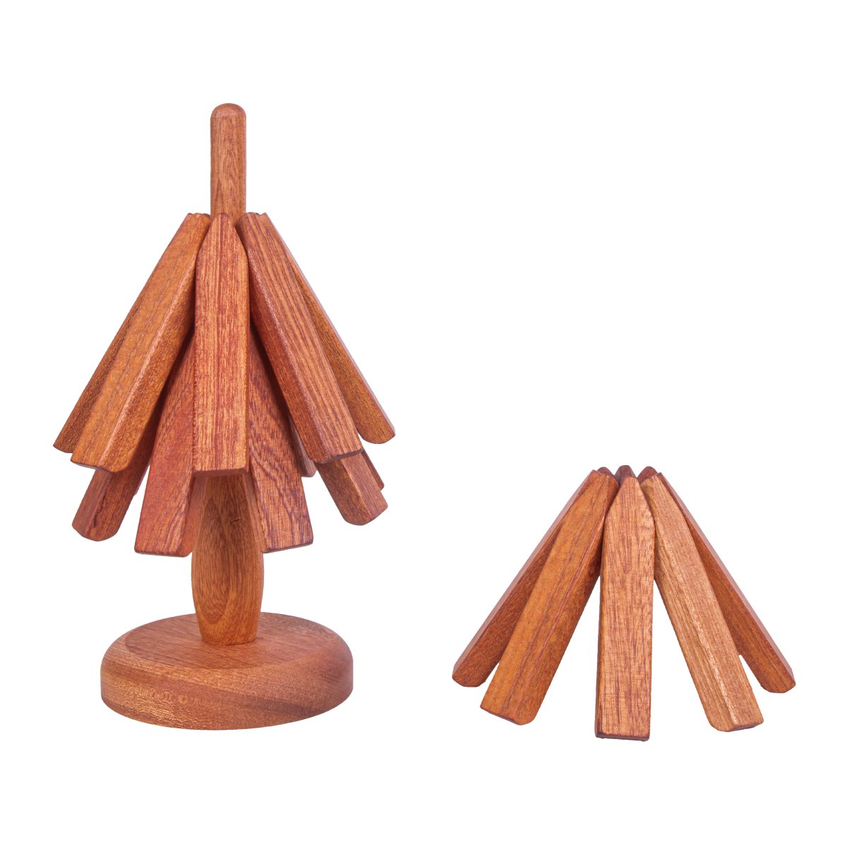 De QUVIO pannenonderzetters brengen een speelse sfeer in elke keuken. De creatieve vormgeving van de standaard voegt een speels element toe, terwijl de natuurlijke houttinten warmte en een rustiek karakter bieden. De combinatie van functionaliteit en design maakt het een opvallende aanvulling in zowel moderne als traditionele keukens. Met deze boomvormige standaard wordt zelfs het serveren van een eenvoudige maaltijd een charmante vertoning.