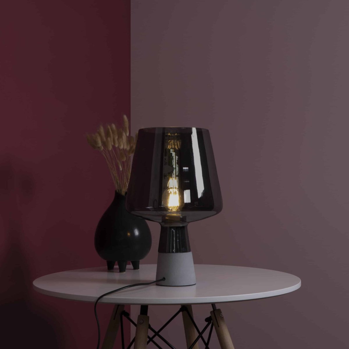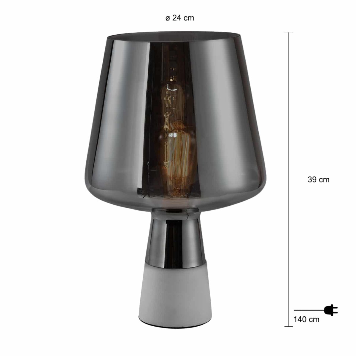Met deze tafellamp met lampenkap ben je voorzien van een designlamp met een bijzonder design die diffuus licht verspreidt. De QUVIO lamp met lampenkap en voet in beton is echt wat jij zoekt. Dankzij het gerookte glas straalt deze lamp een diffuus licht uit en ze is daardoor een echte sfeermaker. Stoere vormen en tegelijk ronde lijnen maken dat deze lamp een echte eyecatcher is. De afmeting van de lamp is 24 x 39 cm (dxh). De maximale snoerlengte inclusief stekker is 140 cm en kunt u eenvoudig inkorten.