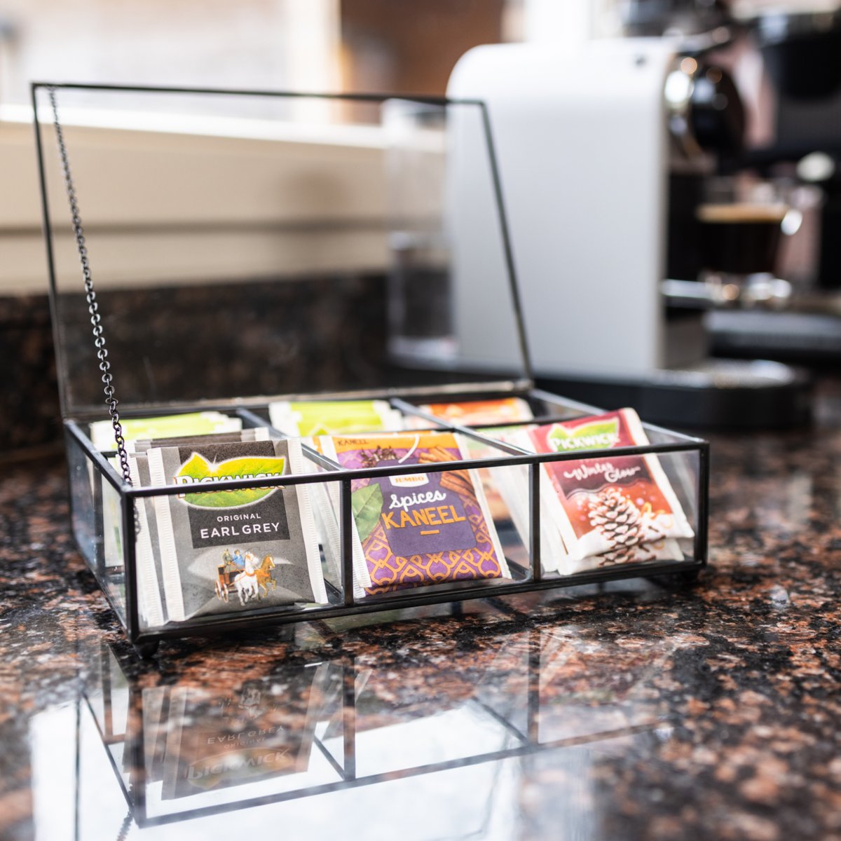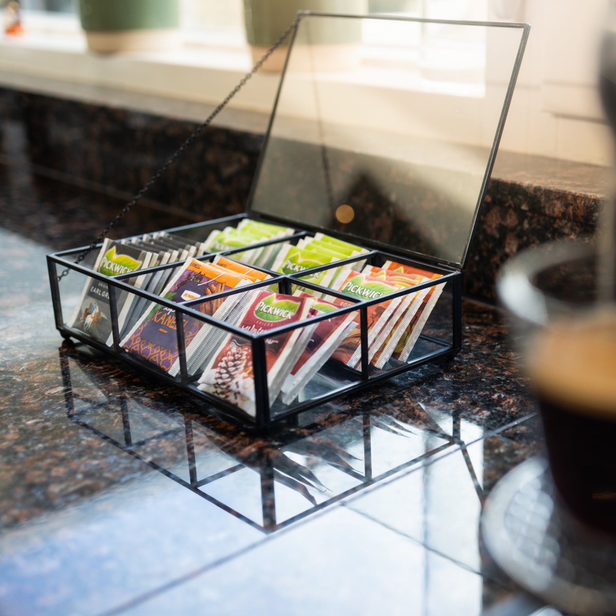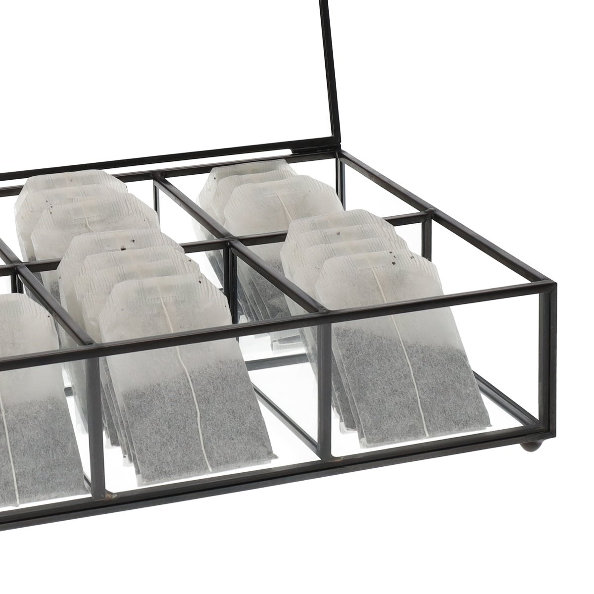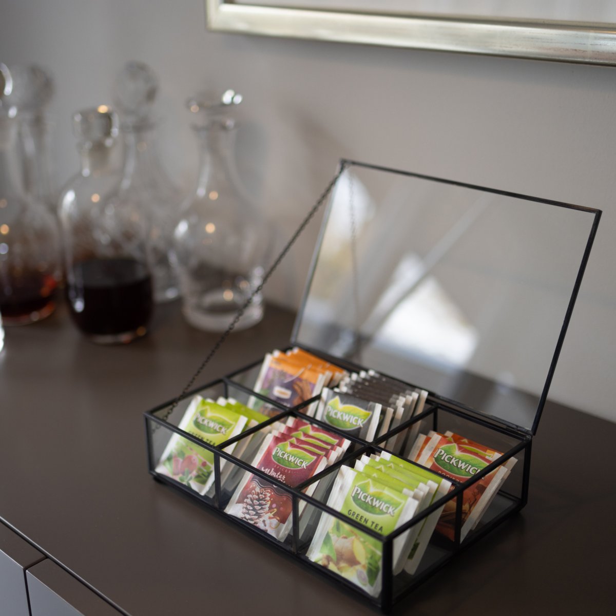 Presenteer theezakjes in een stijlvolle theedoos in het zwart van glas en metaal
