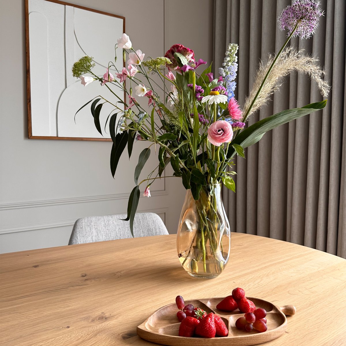 Ben je niet zo dol op droogbloemen? Dan kun je de kreuk vaas natuurlijk vullen met de mooiste verse bloemen. De neutrale kleur van de vaas laat zich uitstekend combineren met alle andere kleuren. Welke kleur bloemen je ook neer wilt zetten, het past zeker goed in deze vaas. Van een romantische bos rode rozen tot een fel gekleurd veldboeket, in deze vaas wordt het nog mooier.