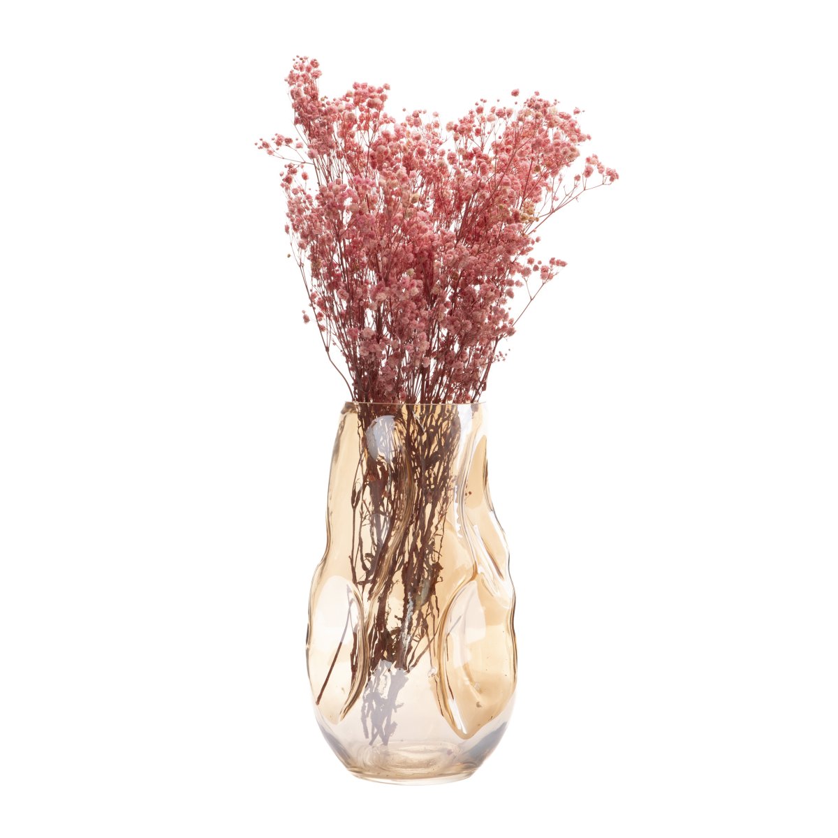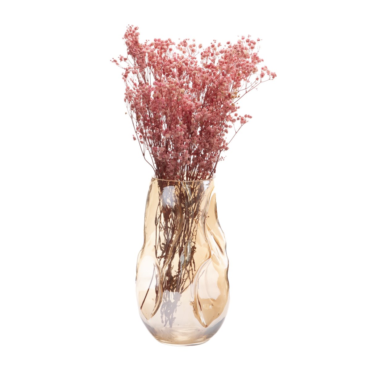 Droogbloemen zijn een echte aanwinst voor jouw interieur. De bloemen blijven lange tijd mooi, waardoor je er dag in dag uit van kunt genieten. De transparant beige kleur van deze vaas met kreukels past perfect bij de neutrale kleuren van een bosje droogbloemen. De vaas is niet zo heel groot, waardoor een klein bosje droogbloemen perfect tot z’n recht komt.