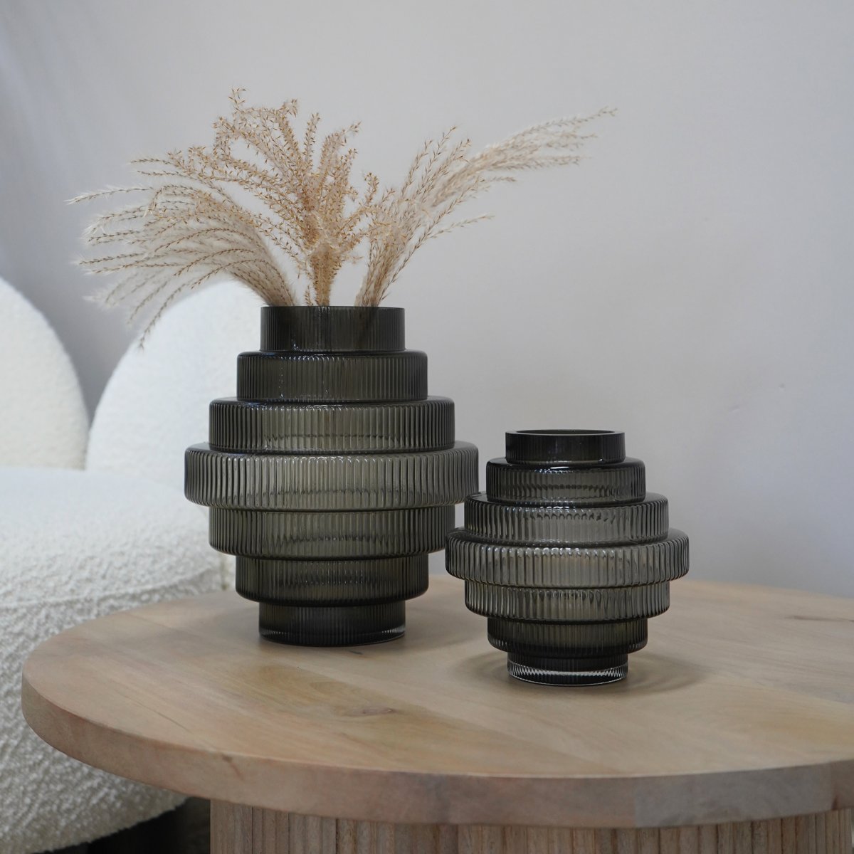 Deze grijze vaas onderscheidt zich door het unieke trap design, wat zorgt voor een eigentijdse uitstraling. Het moderne ontwerp maakt deze glazen vaas niet alleen geschikt voor verse bloemen, maar ook ideaal als decoratief vaasje voor droogbloemen. Of je nu één enkele bloem plaatst of een volledig boeket, deze bloemenvaas laat het prachtig tot zijn recht komen.