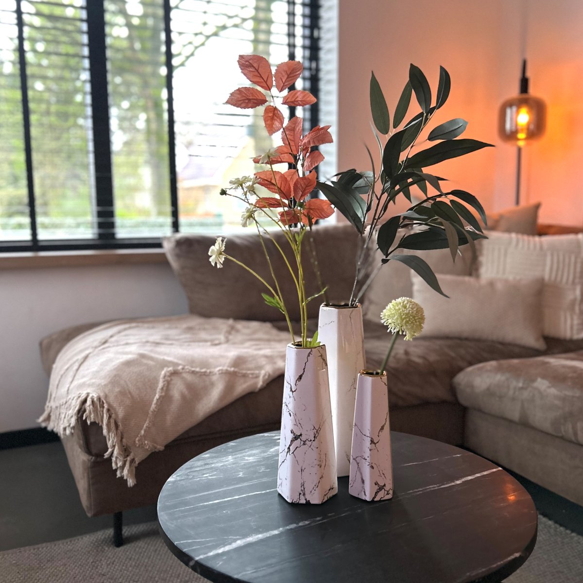 De vaas met keramiek formaat large heeft een marble look, wat betekent dat het lijkt alsof de vaas van marmer gemaakt is. Zowel het textuur als het uiterlijk van de vaas lijken op dat van marmer. Dit geeft de vaas een luxe uitstraling.