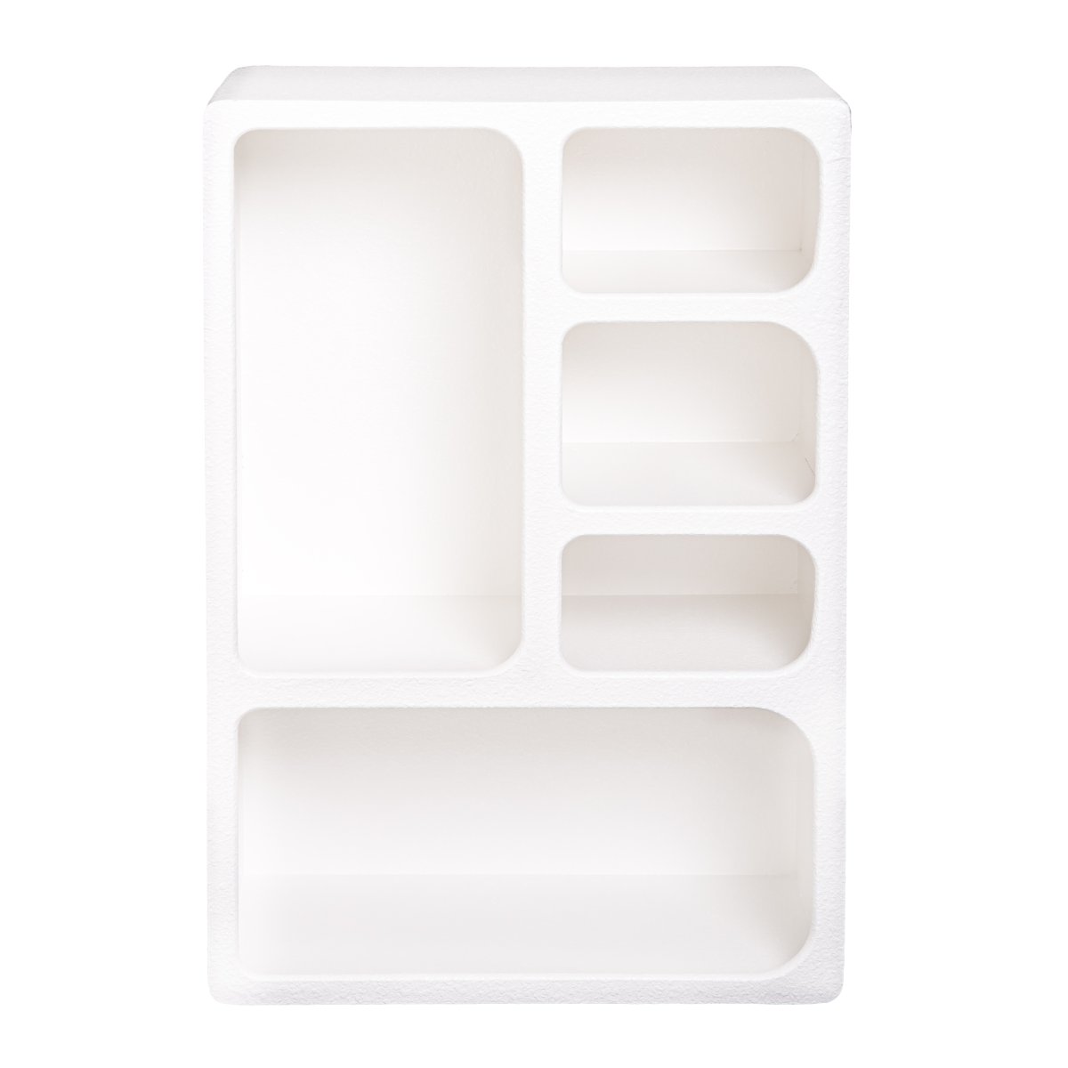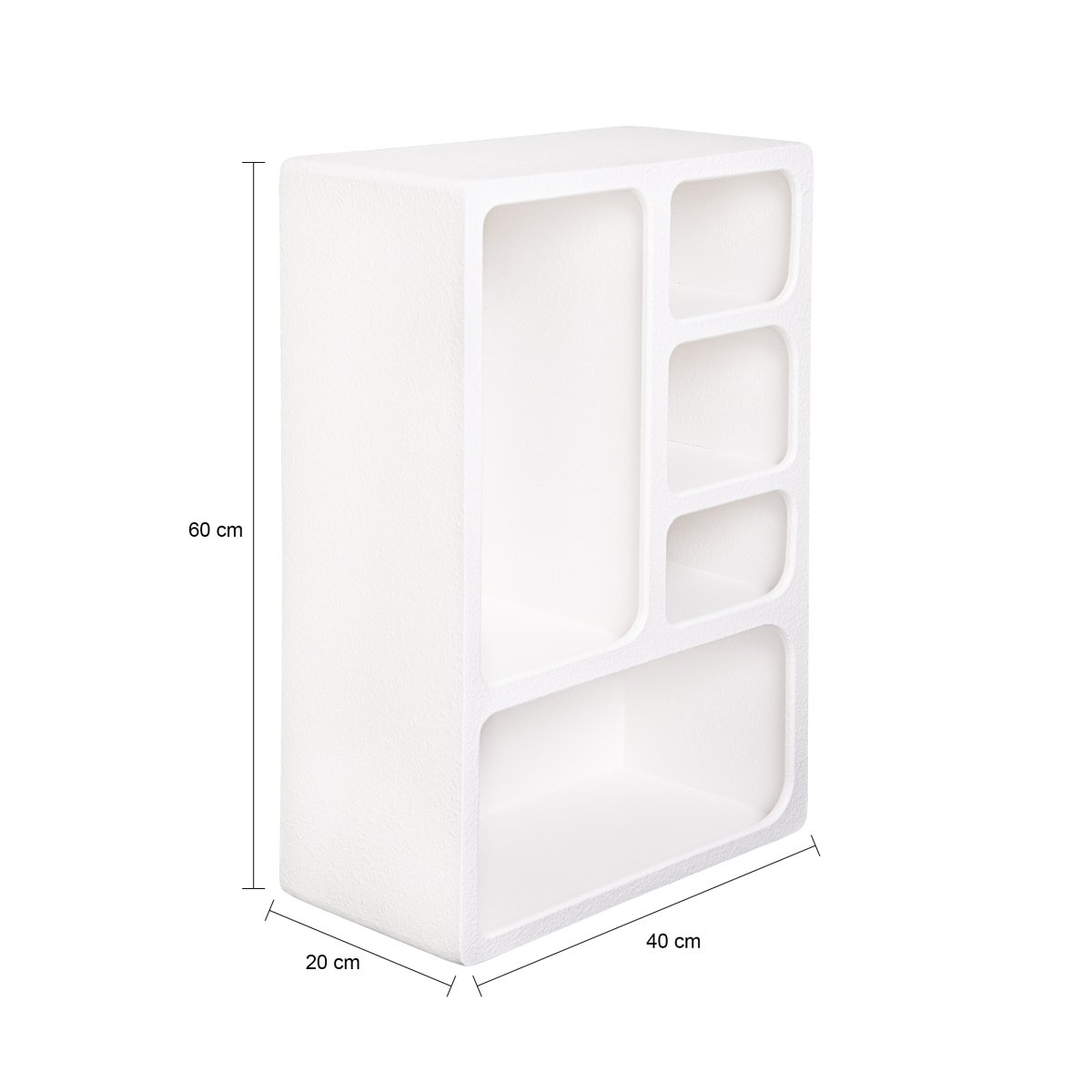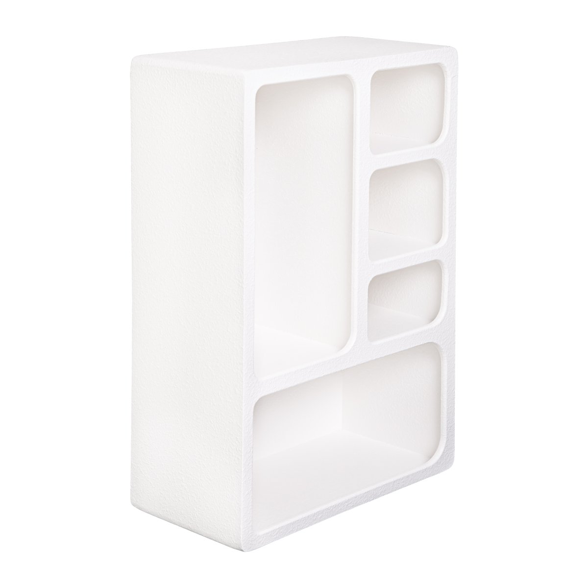 Het wandkastje heeft een modern en minimalistisch ontwerp met een asymmetrisch indeling. Het gebruik van verschillende vormen en formaten van de vakken zorgt voor een speelse uitstraling. De witte kleur benadrukt een schone en strakke look die goed past in elk interieur. Het is een eyecatcher vanwege de vormen van de vakken, maar de kleur zorgt ervoor dat het ook een rustige uitstraling heeft.