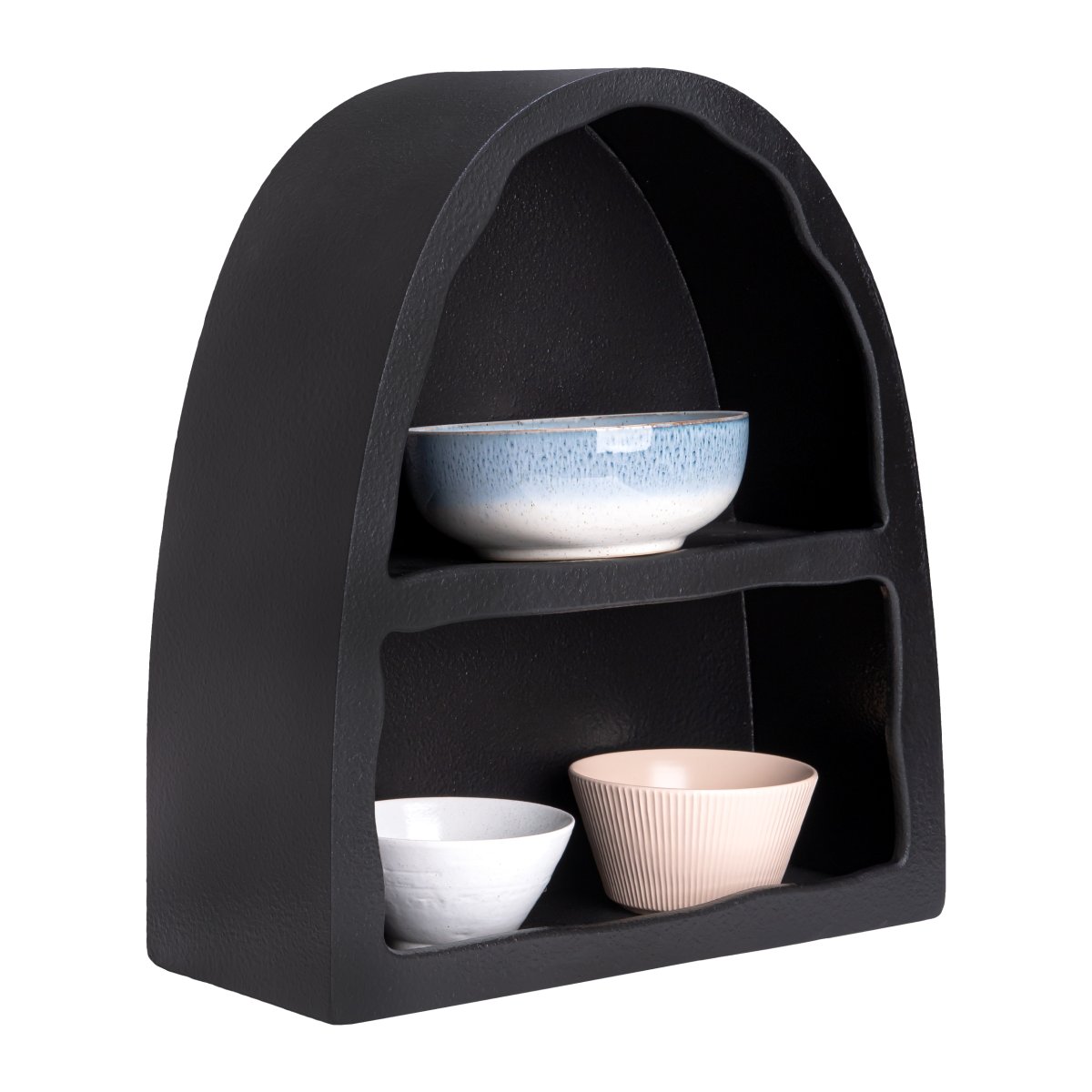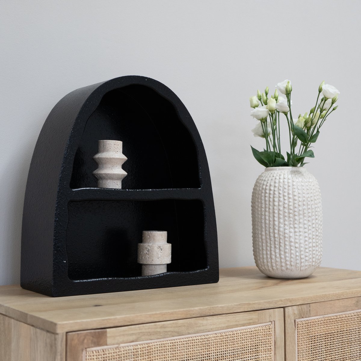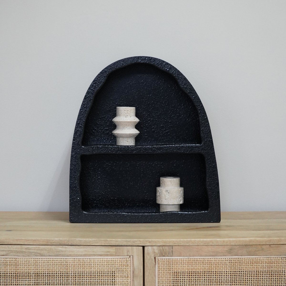 De QUVIO vakkenkast is veelzijdig in gebruik en past in verschillende ruimtes in huis. In de woonkamer kan de kast dienen voor het tentoonstellen van kleien kunstvoorwerpen of fotolijstjes, terwijl het in de keuken handig is voor kruidenpotjes of servies. In de badkamer biedt de vakkenkast een stijlvolle opslagmogelijkheid voor verzorgingsproducten en handdoeken. Het zwarte design maakt het een subtiele toevoeging aan je interieur.