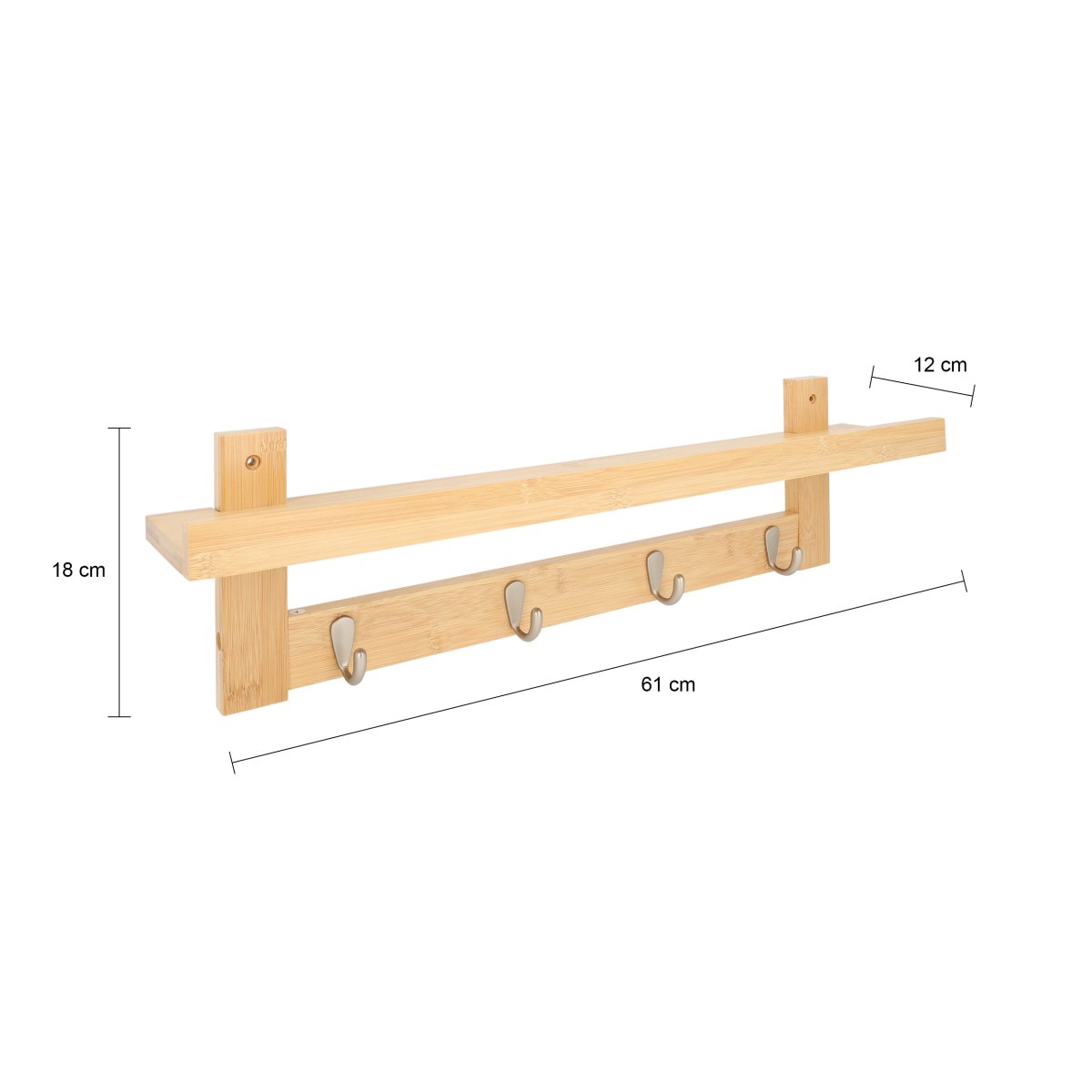 Houten wandkapstok met 4 haken en legplank voor decoratieve items in de gang