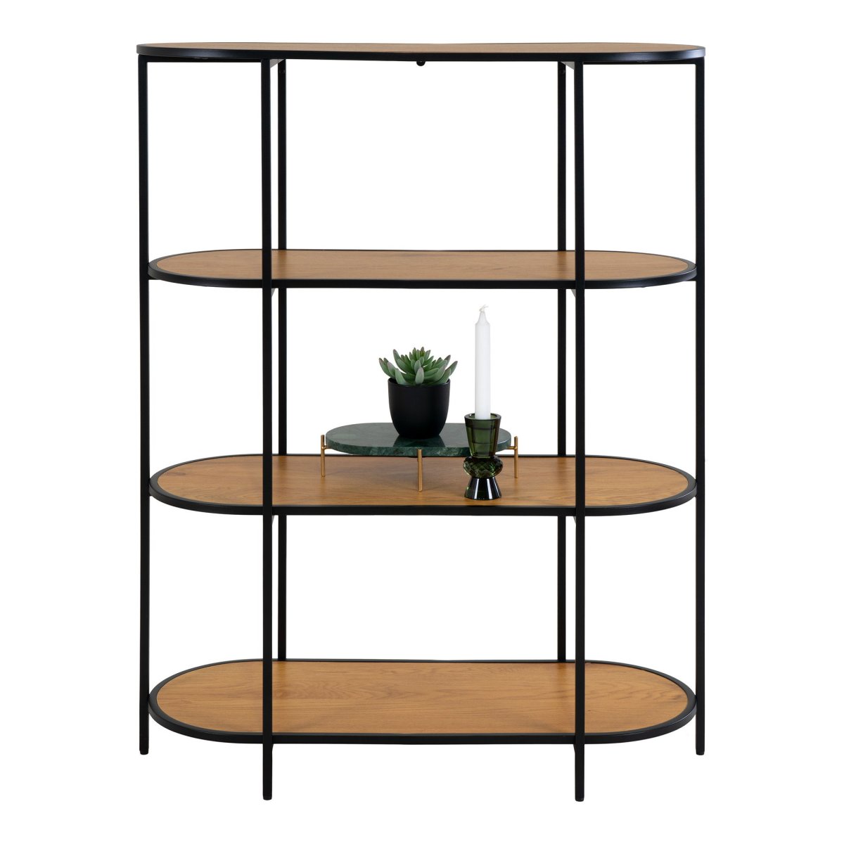 De QUVIO wandkast Gothenburg is een stijlvolle en functionele toevoeging aan elk interieur. Met zijn ovale vorm en vier planken biedt deze plank voldoende opbergruimte voor boeken, decoraties en meer. Het eikenhouten uiterlijk in combinatie met het zwarte frame geeft een moderne en elegante uitstraling.