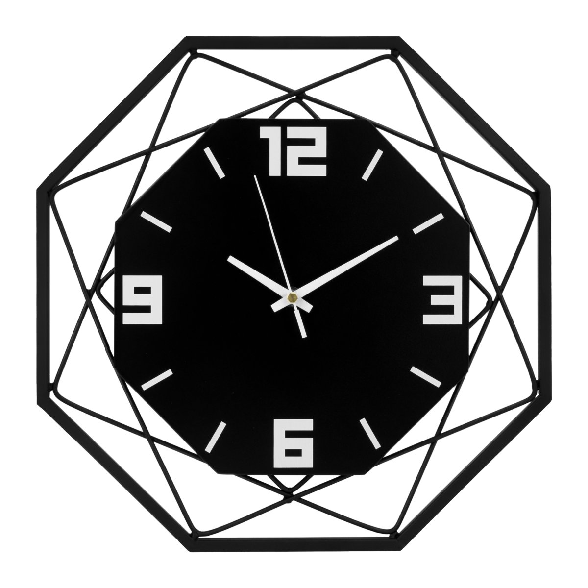 De wandklok heeft een industriële stijl. De wijzerplaat zelf is een achthoek met daarop de getallen drie, zes, negen en twaalf. De andere getallen zijn niet uitgeschreven, maar gemarkeerd met een streep. De witte cijfers en wijzers zorgen voor een goed contrast, zodat je de tijd perfect kunt lezen. De hoekige, zwarte wandklok past perfect in een industrieel interieur.