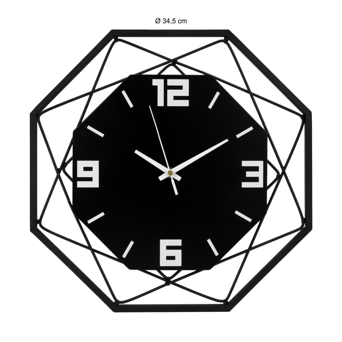 Rondom de achthoekige wijzerplaat heeft de klok een metalen frame. Dit frame heeft een hoogte en breedte van 35 centimeter en is ook achthoekig. Tussen het frame en de wijzerplaat zie je nog twee vierkante frames, die iets dunner zijn en waarmee een mooi patroon gecreëerd is.