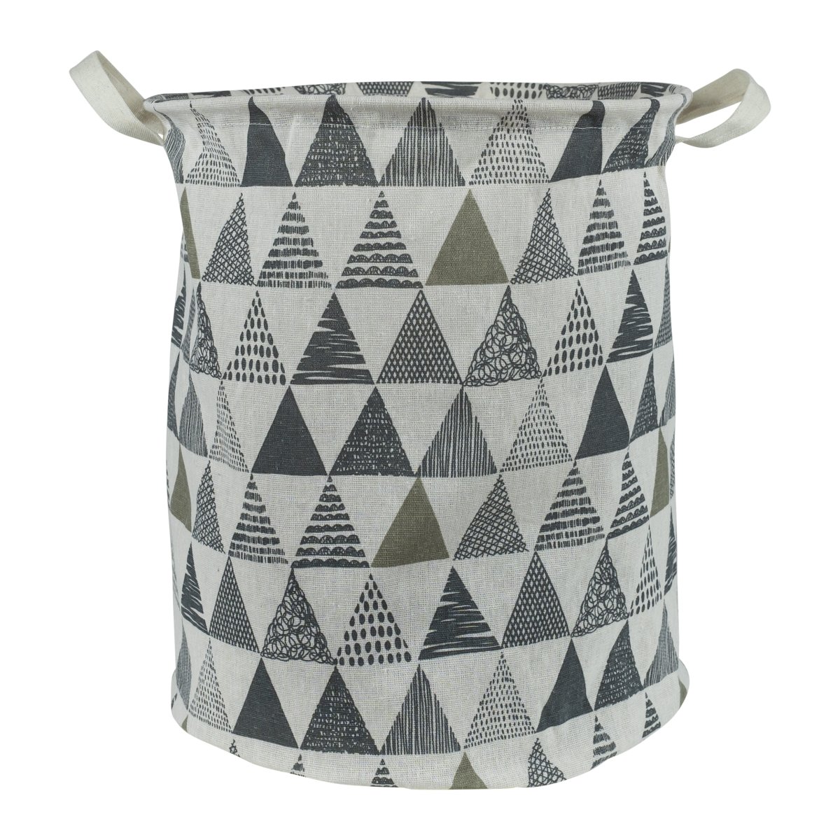 Het driehoek patroon van deze wasmand met driehoeken bevat de kleuren; beige, antraciet en groen. Dit geeft de waszak een zachte uitstraling. Je combineert de wasmand daardoor eenvoudig met andere kleuren, zoals zwart en wit, maar ook felle kleuren matchen goed. Wat vind jij de mooiste combinatie? Bekijk ook het volledige assortiment wasmanden.