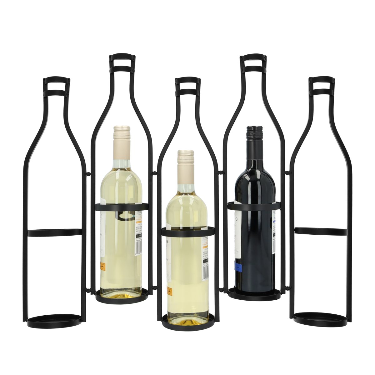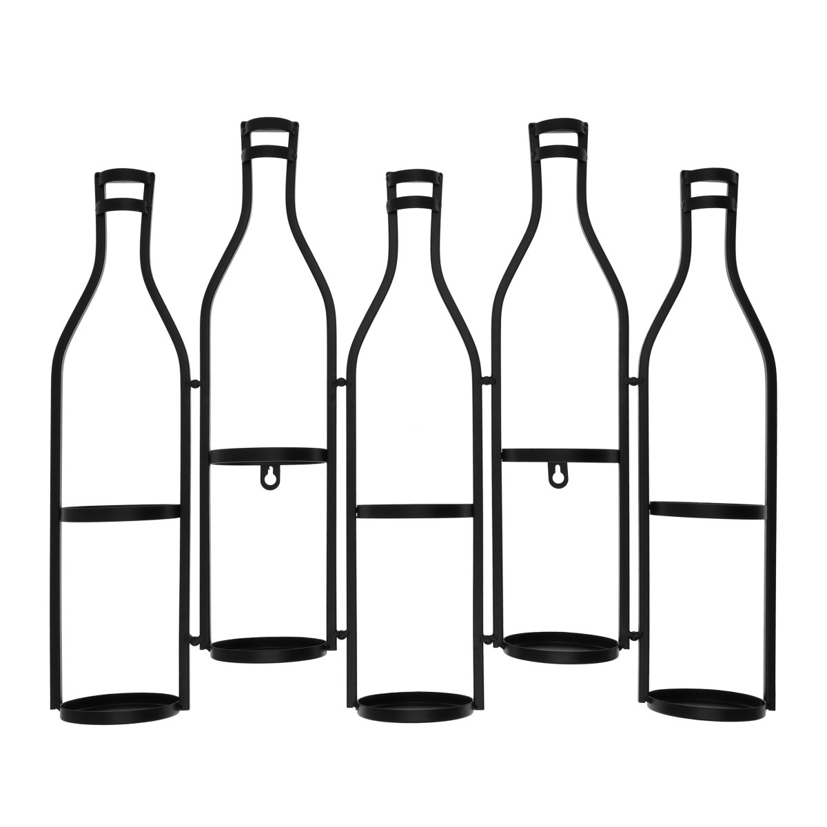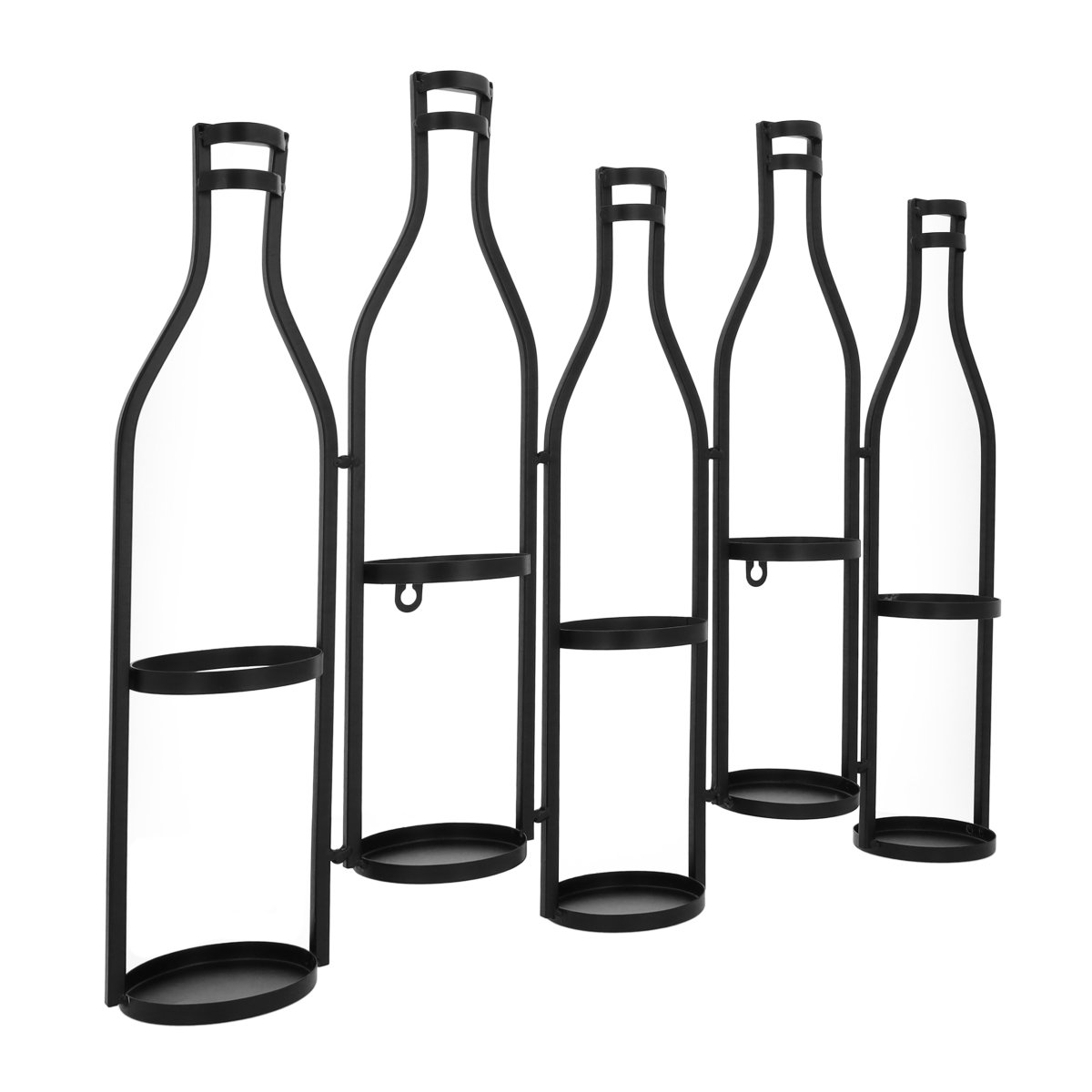 Een decoratief zwart wijnrek voor 5 flessen met wandmontage