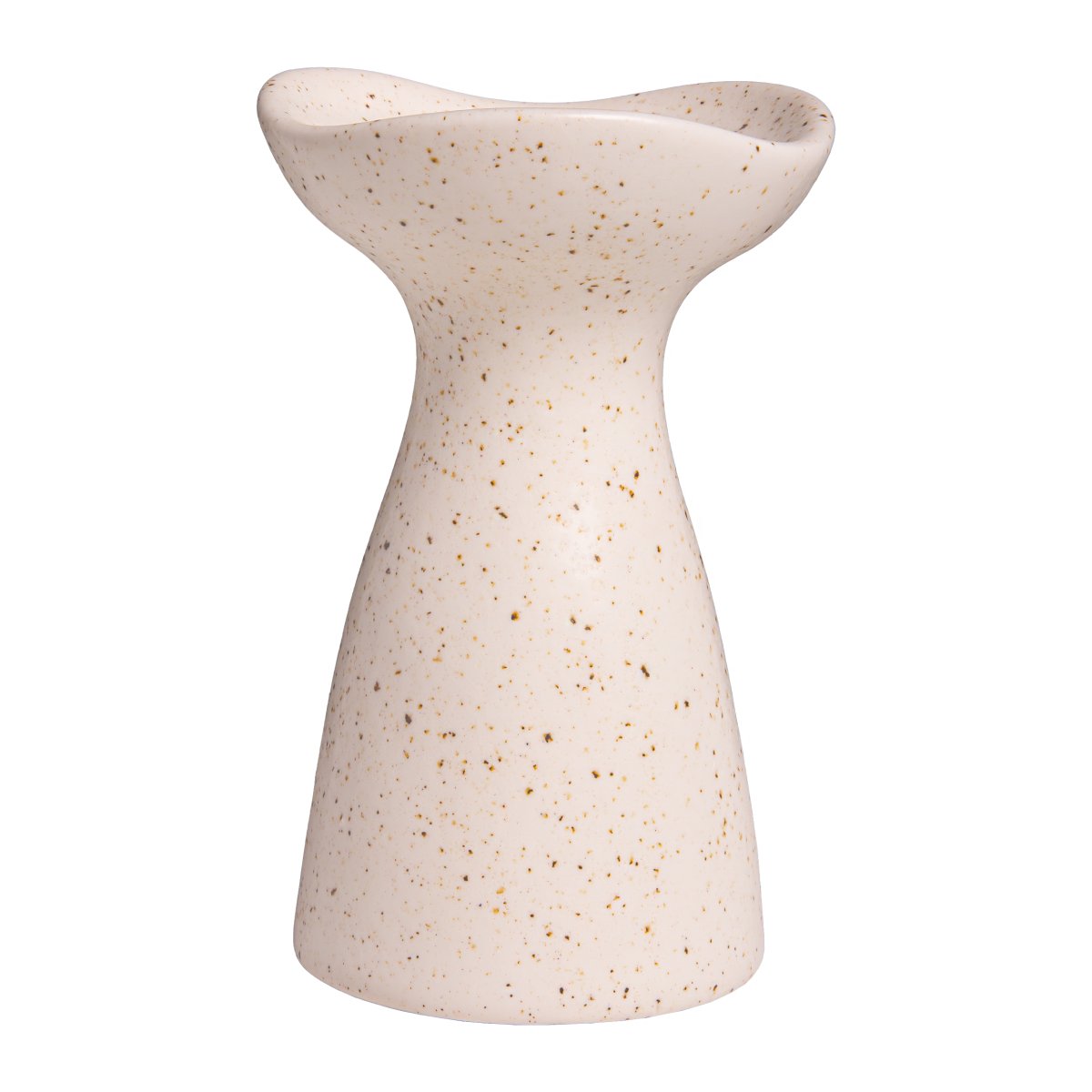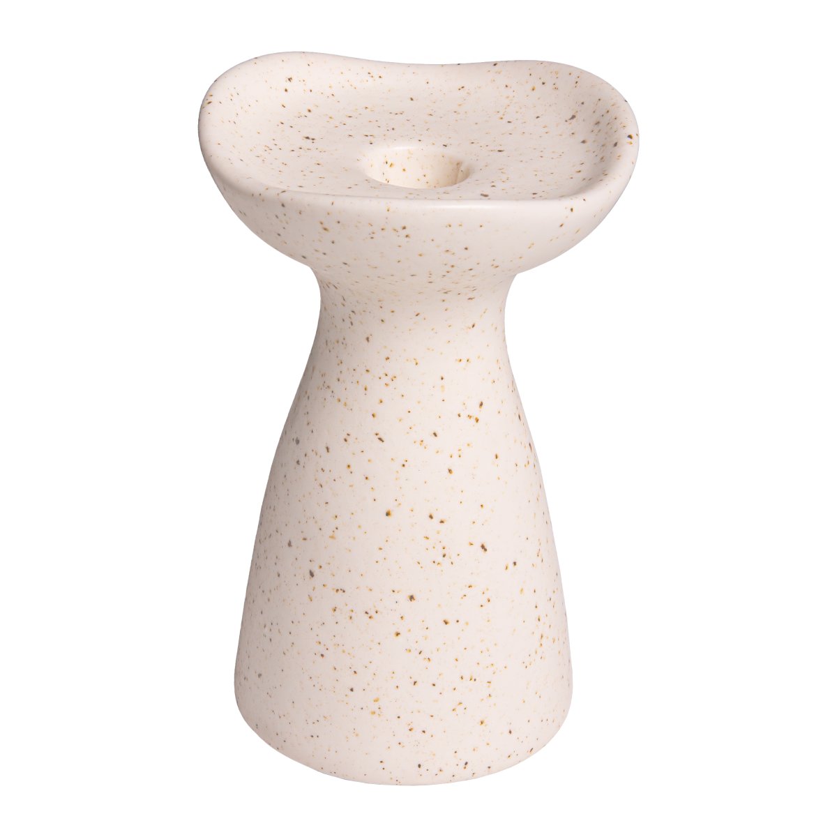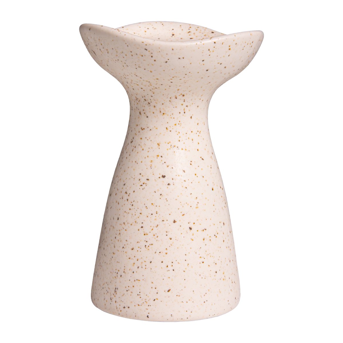 Strak en functioneel, deze kandelaar met neutrale kleur en vloeiende lijnen is een perfecte match voor een modern interieur. Het ontwerp belichaamt rust en eenvoud en heeft toch een uniek model. De lichte tint verrijkt met spikkels zorgt voor een verfrissende uitstraling, wat het eenvoudig maakt om het te combineren met andere woonaccessoires. De vorm versmalt subtiel in het midden, waardoor het silhouet doet denken aan een zandloper.