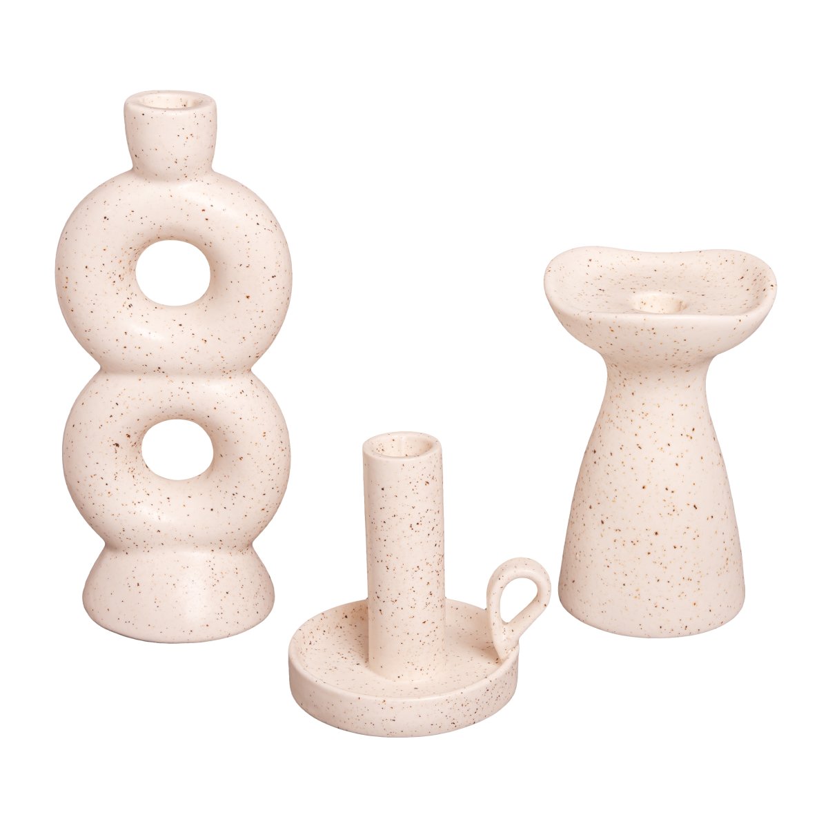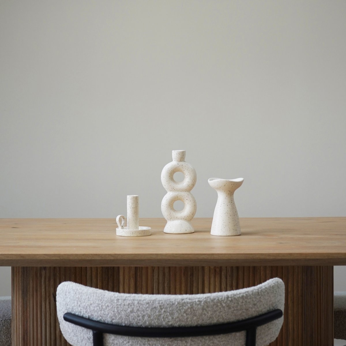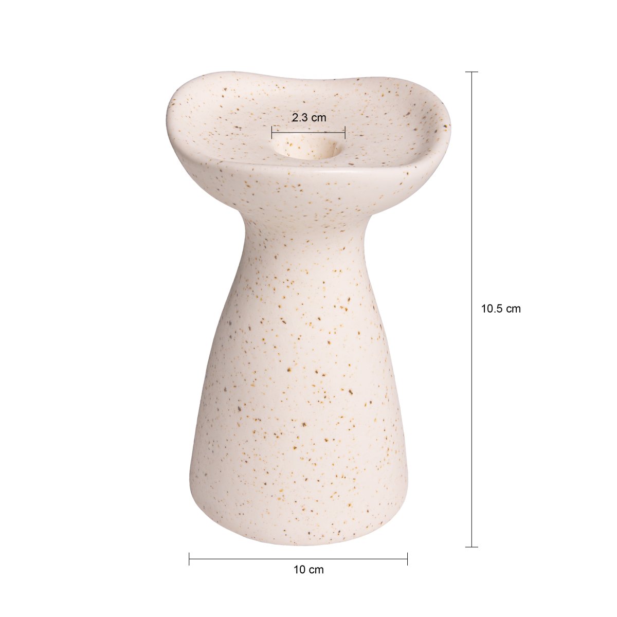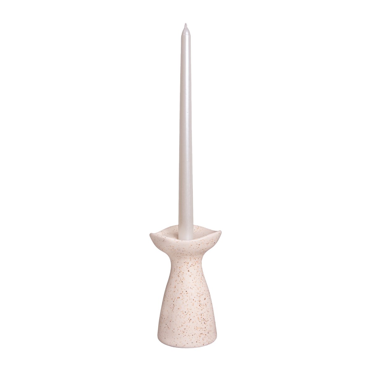Strak en functioneel, deze kandelaar met neutrale kleur en vloeiende lijnen is een perfecte match voor een modern interieur. Het ontwerp belichaamt rust en eenvoud en heeft toch een uniek model. De lichte tint verrijkt met spikkels zorgt voor een verfrissende uitstraling, wat het eenvoudig maakt om het te combineren met andere woonaccessoires. De vorm versmalt subtiel in het midden, waardoor het silhouet doet denken aan een zandloper.