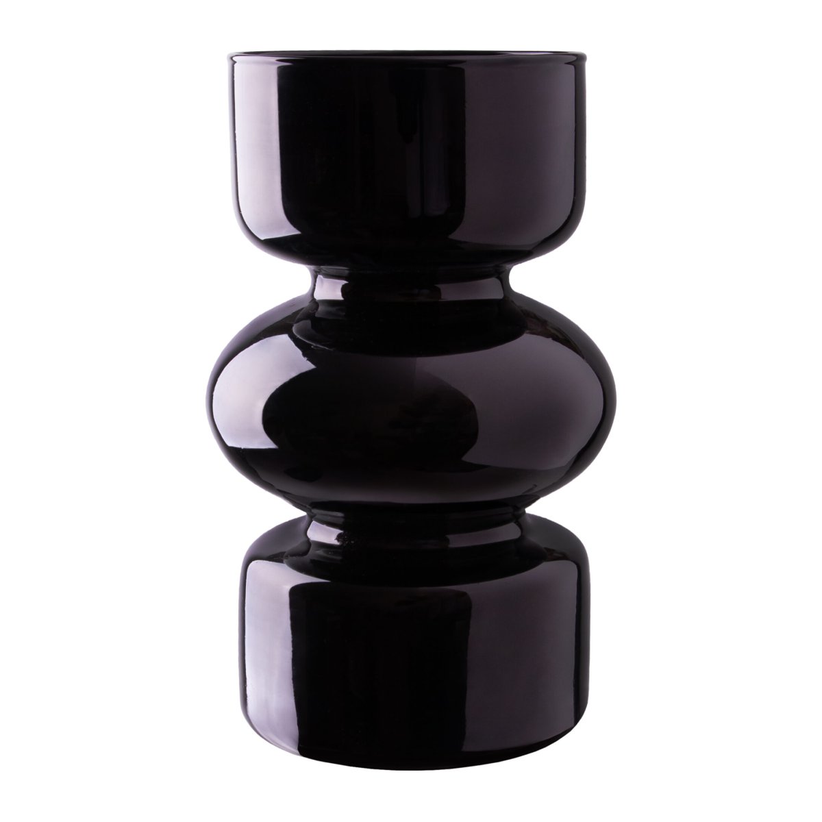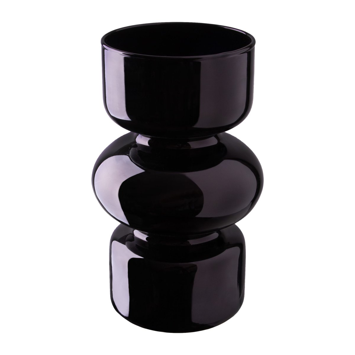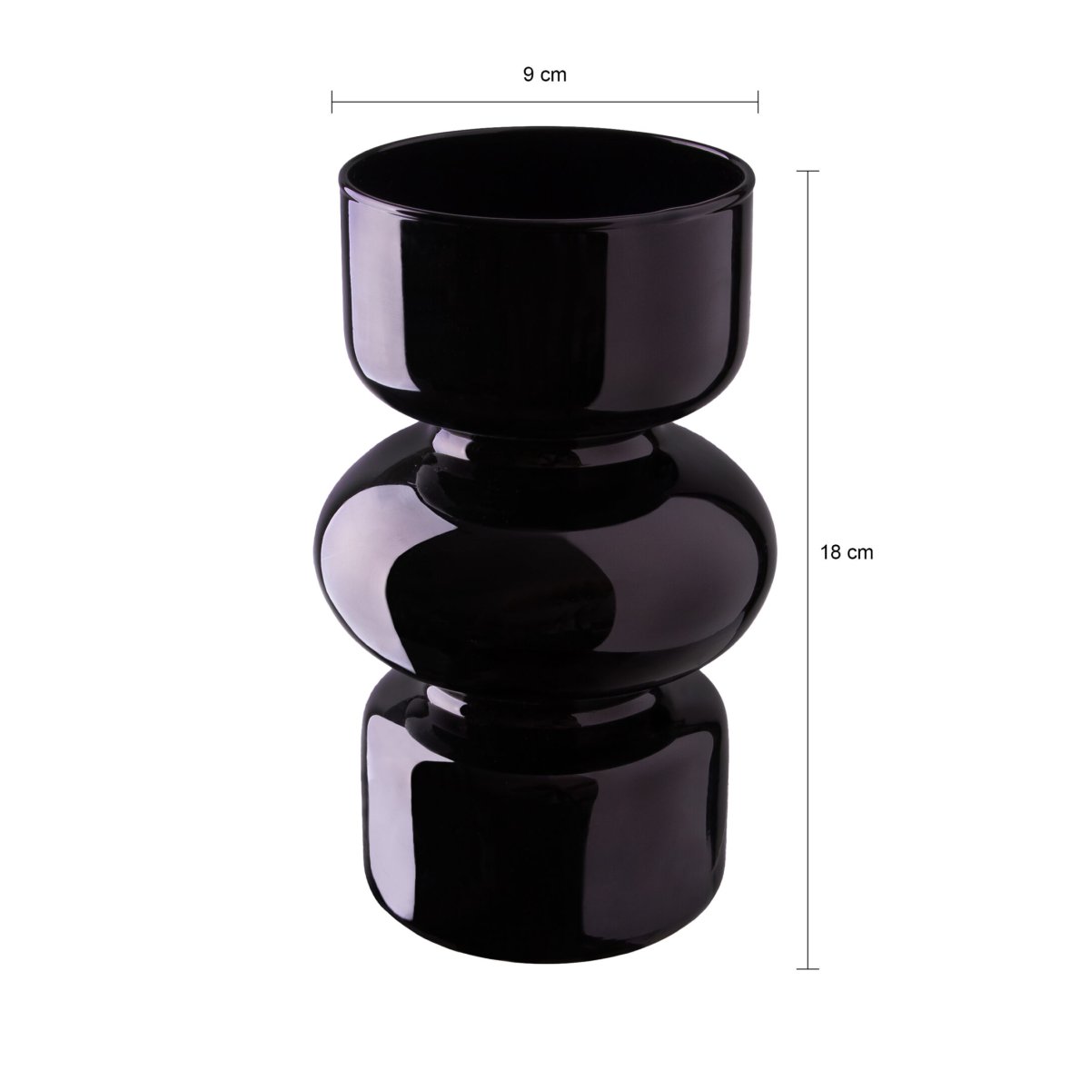 Breng sfeer in huis met deze elegante zandloper vaas van glas in zwart. Dankzij het unieke zandloperdesign en het compacte formaat van ø9x18cm past deze glazen vaas perfect op een eettafel, vensterbank of in een open kast. Gebruik de vaas als bloemen of droogbloemenvaas en creëer een sfeervol accent in je interieur. De combinatie van het tijdloze zwarte glas en de verfijnde vorm maakt deze decoratieve vaas een echte blikvanger.