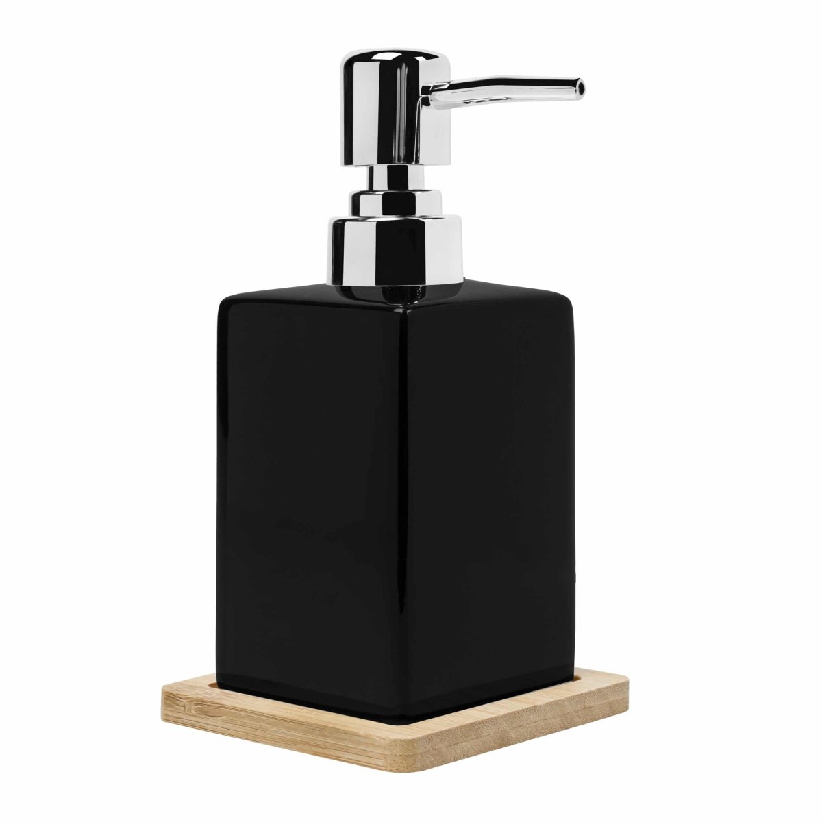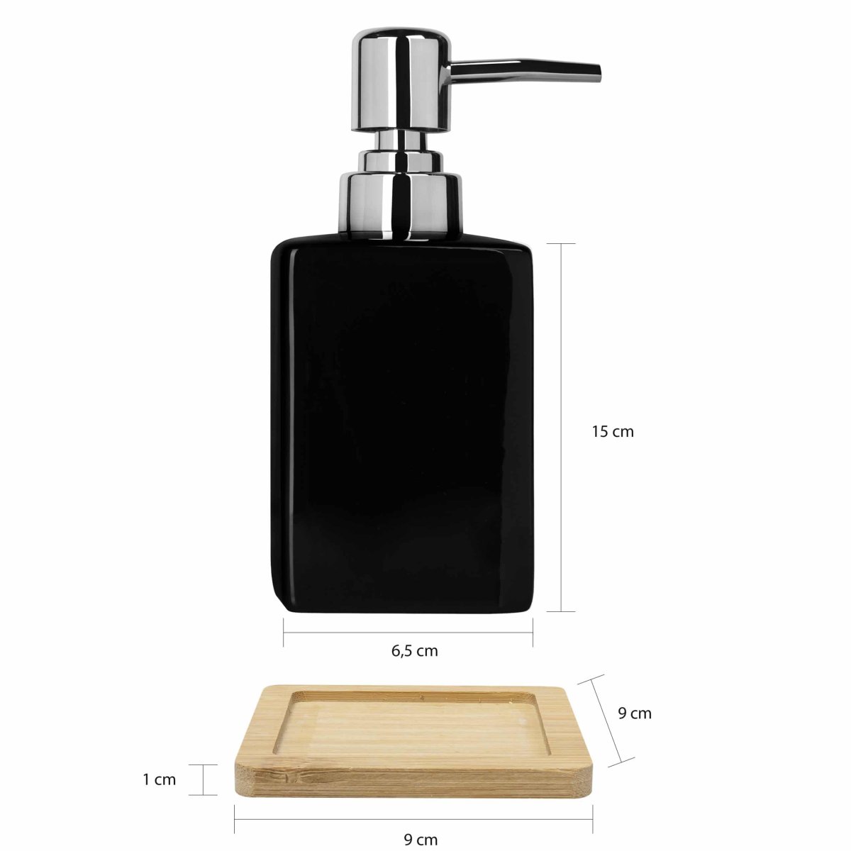Keramieken zwarte zeepdispenser met houten onderzetter