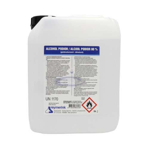 Reymerink Alcohol Podior 80% is een gebruiksklare vloeistof voor de desinfectie van oppervlakken, (intacte) huid en instrumenten/gereedschappen. Podior 80% bestrijdt bacteriën, gisten en schimmels. De desinfectievloeistof op basis van gedenatureerde ethanol wordt gebruikt in de gezondheidszorg, pedicurepraktijken, schoonheidssalons, nagelstudio’s, tattooshops etc. Ook effectief tegen coronavirussen.