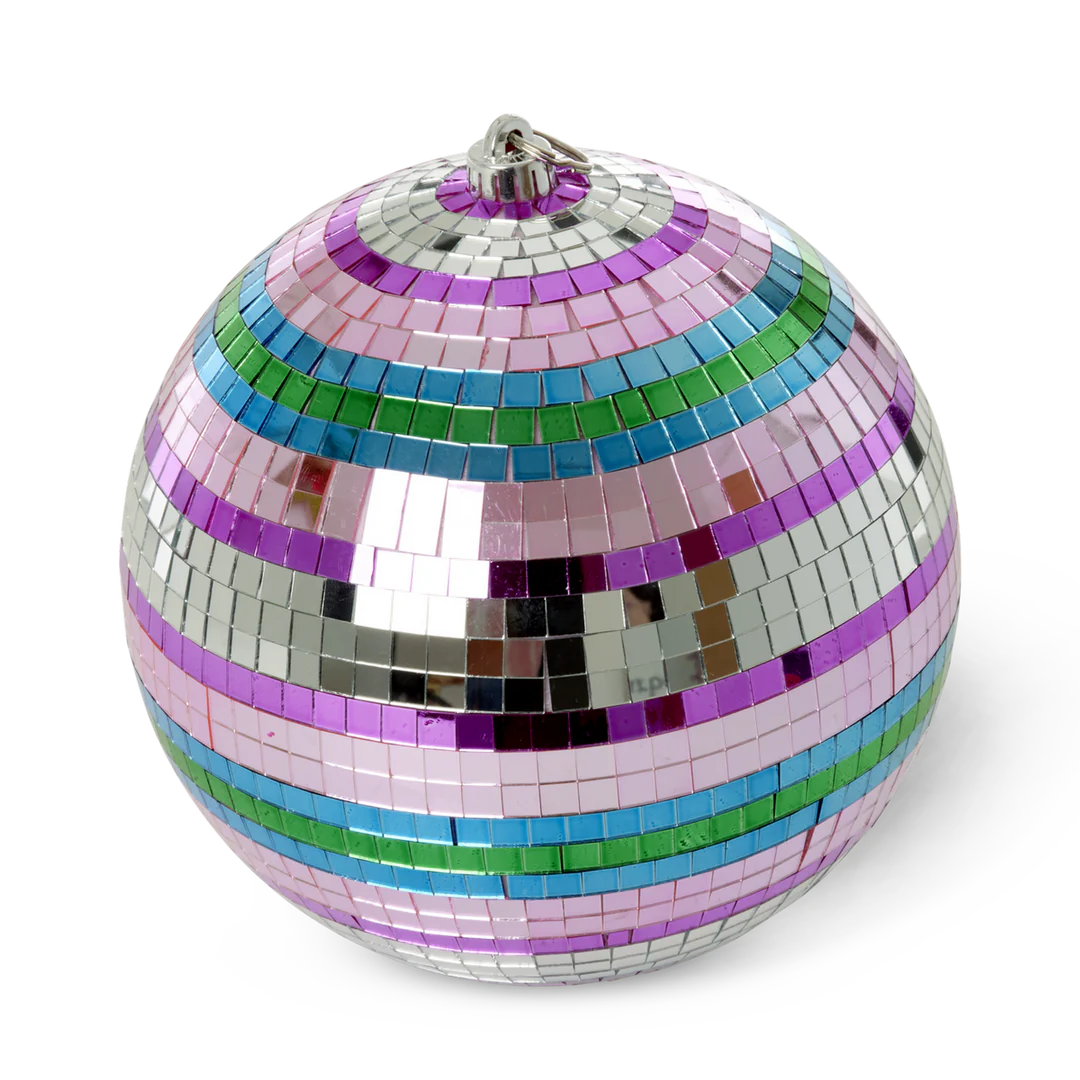 Niets zegt duidelijker “laten we er een feestje van maken” dan een discobal. Alles wordt automatisch feestelijker als deze sprankelende ballen boven je hoofd hangen. Deze grote discobal heeft roze, zilveren, groene en blauwe strepen en een diameter van 25 cm. Geef een lichte draai aan de bal en zie hoe het een regenboog van licht in je kamer geeft!