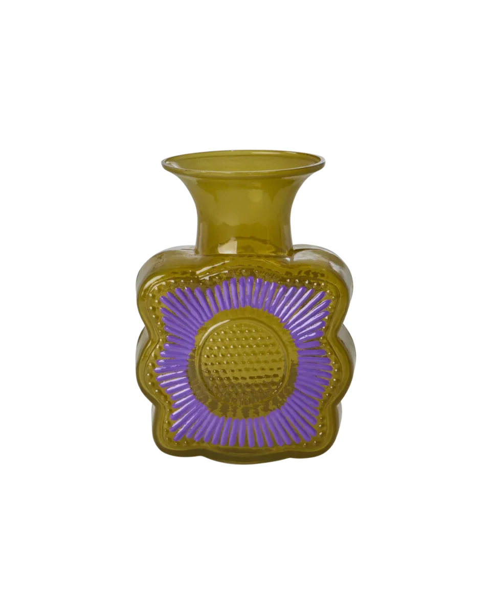 Schattig en origineel vaasje in een mooie curry kleur met een paars bloemmotief in reliëf. Het vaasje is gemaakt van glas en is perfect voor wat bloemetjes, zowel verse als gedroogde!