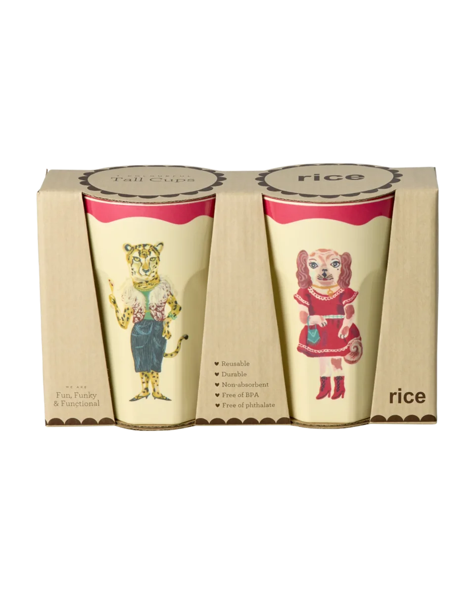 We vinden de prints die zijn ontworpen door Nathalie Lété helemaal geweldig. De ene print heeft een chique hond die graag een avondje uit wilt en de ander print heeft een diva luipaard die van een cocktail geniet – allemaal op een set van 2 hoge melamine bekers – ZO leuk!