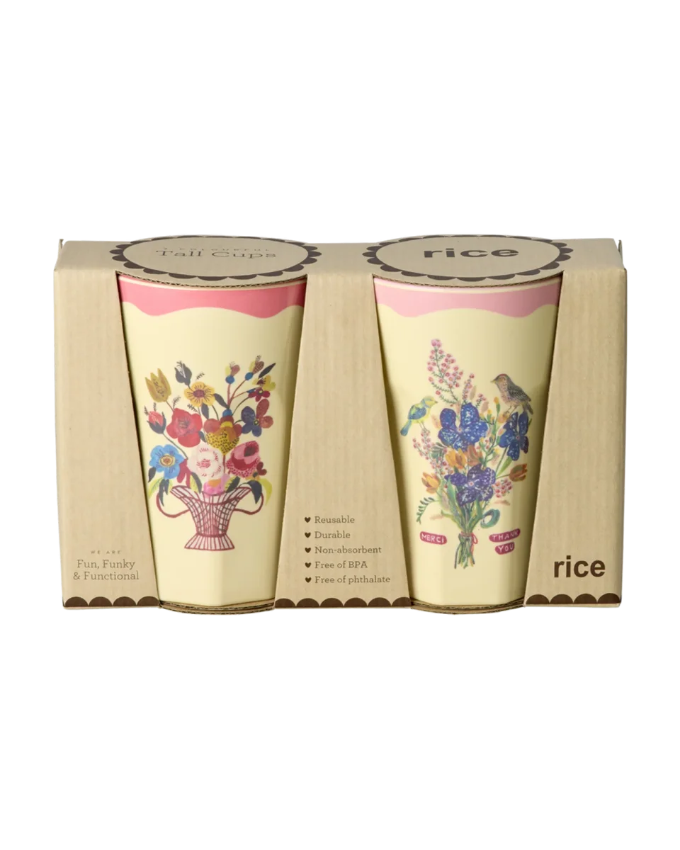We vinden de bloemenprints die zijn ontworpen door Nathalie Lété helemaal geweldig. De ene print heeft bloemen in alle kleuren van de regenboog en de andere heeft leuke vogeltjes – allemaal op een set van 2 hoge melamine bekers – ZO leuk!