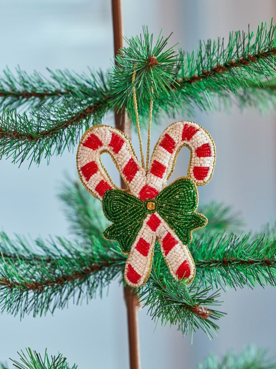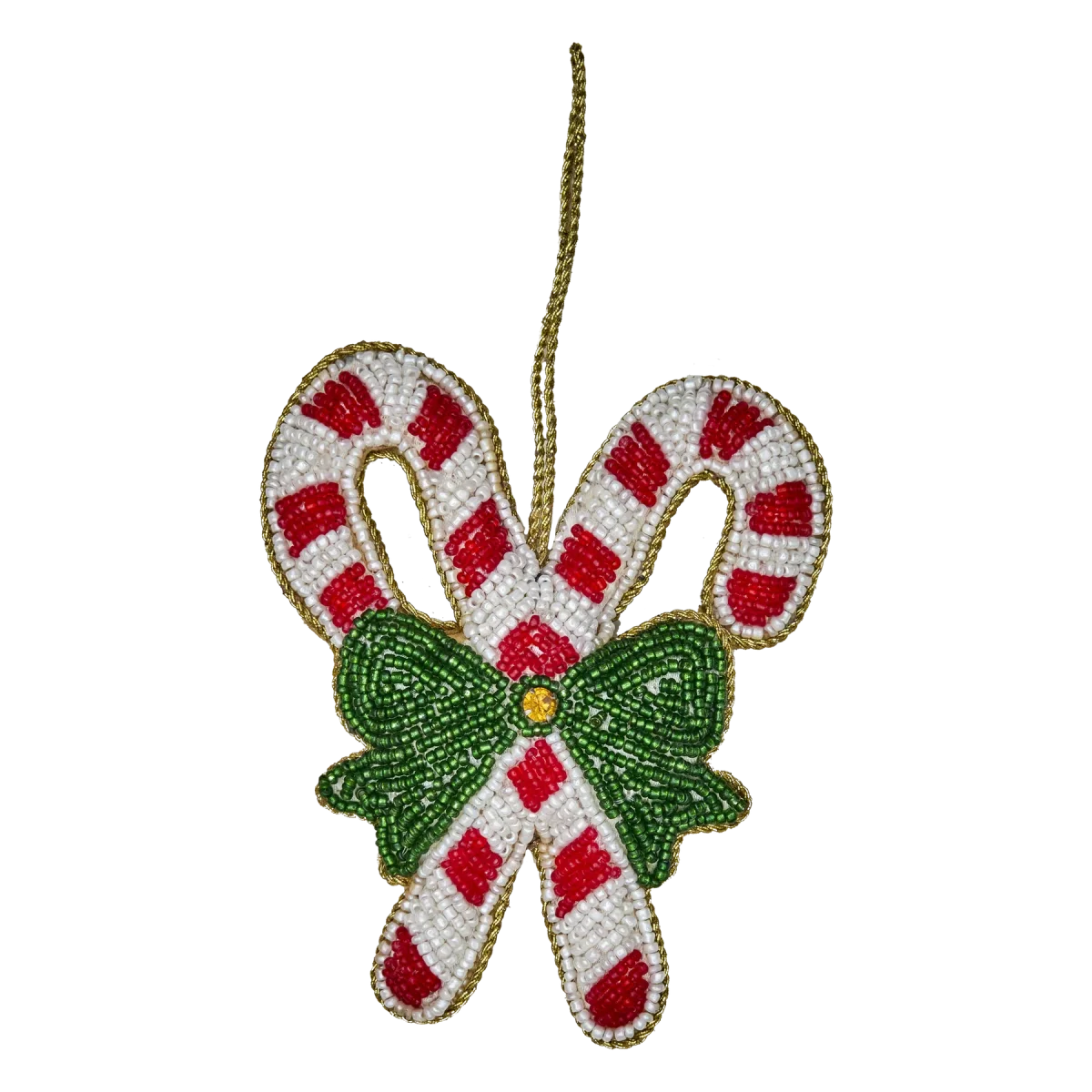 Zorg voor wat kerstmagie in je huis met deze prachtige, handgemaakte versiering. Deze decoratie is versierd met kralen en heeft de vorm van twee kerstzuurstokjes die met elkaar vastgebonden zijn met een prachtige groene strik. Het zal geweldig staan in je kerstboom, je kan het voor het raam hangen of je kan het gebruiken om je tafel leuk op te dekken.