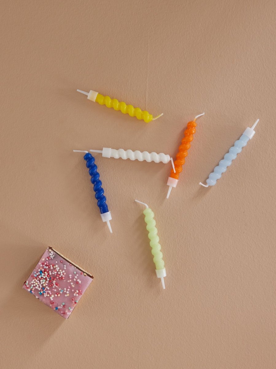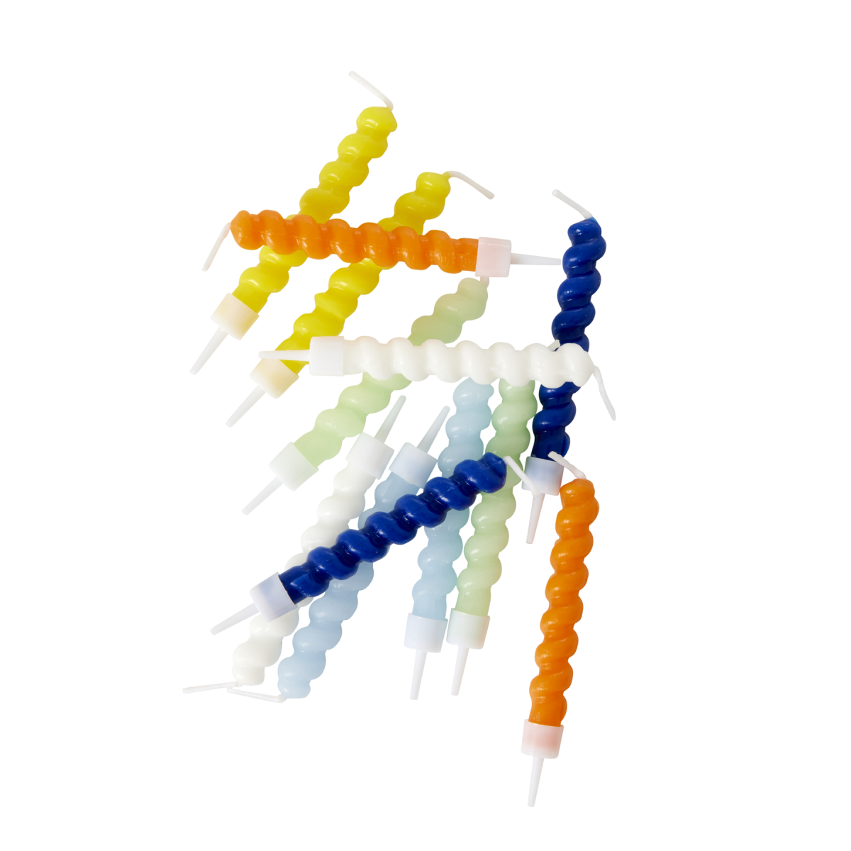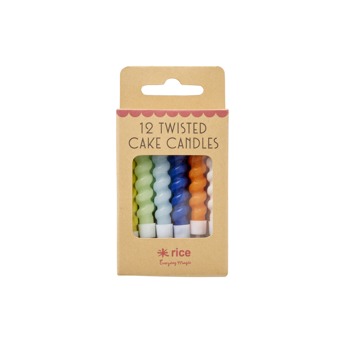 12 gekleurde en gedraaide kaarsjes van 9 cm hoog. Voor als je wat te vieren hebt.