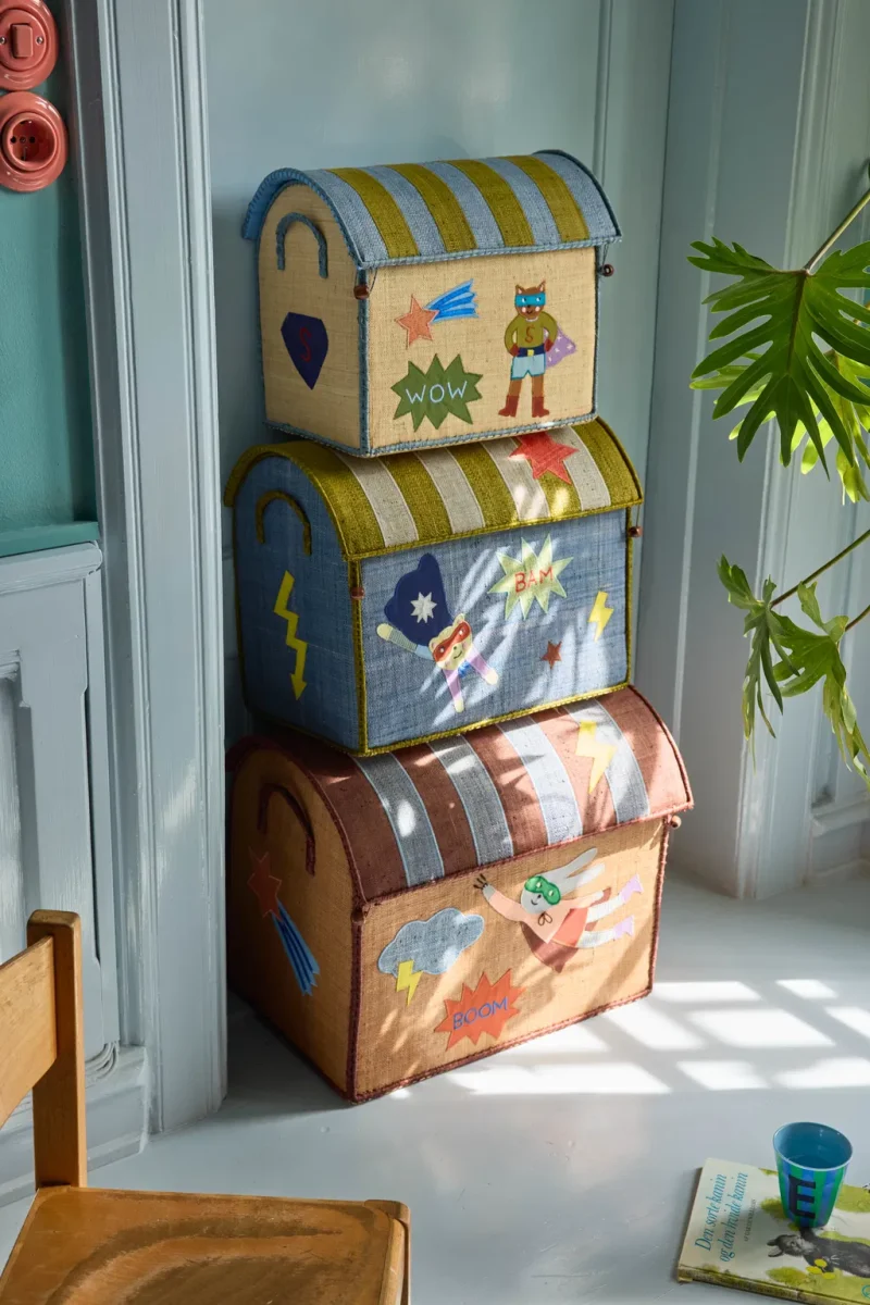 Elke held heeft een schuilplek nodig! Verberg je waardevolle spullen en bereid je voor op een dag vol leuke fantasie! Dit kleine opberghuisje van raffia met een gestreepte deksel en een heldenthema is niet alleen geweldig om mee te spelen, maar ook de perfecte plek om speelgoed, boeken, dekens en andere spullen in op te bergen die je niet wilt laten rondslingeren!