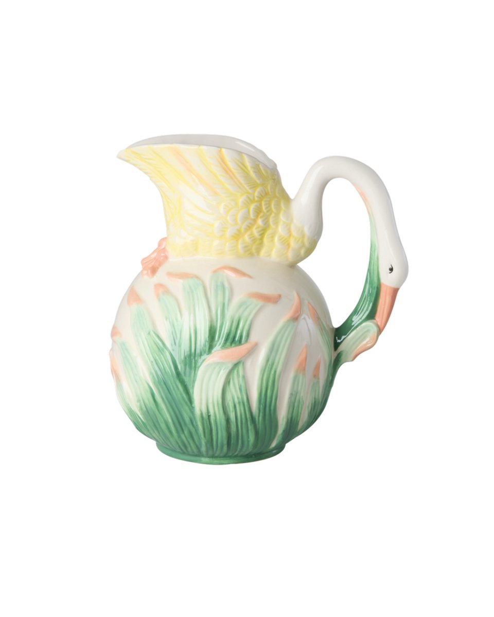 Mooie en bijzondere kan in een leuke gele en groene kleur. De kan is van keramiek en heeft de vorm van een zwaan. De kan heeft een inhoud van 1.2 liter en is geschikt voor vrijwel alles. Water voor de lunch, een fruitensap voor de brunch of een lekkere wijn voor bij het avondeten … of je kan er je favoriete bloemen in zetten en het gebruiken als vaas!