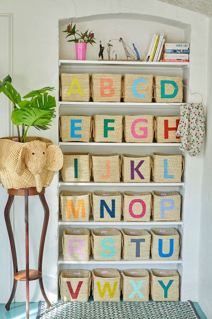 Vierkante mand van raffia. Super mooie naturel kleur, met 2 handvaten en een gekleurde letter er op! Handgemaakt door een prachtig project in Madagascar!