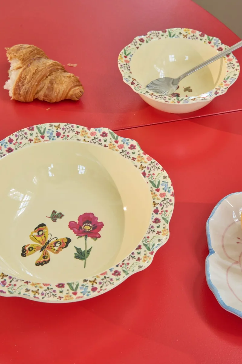 We zijn helemaal weg van dit kommetje! Het is ontworpen in samenwerking met Nathalie Lété en geïnspireerd op vintage ontwerpen. De gele vlinder en de prachtige bloemenprint op de rand zorgen ervoor dat het kommetje perfect is voor een salade, wat aardappeltjes of om wat snoep in te serveren. Het kommetje is gemaakt van het duurzame materiaal melamine, wat perfect is voor dagelijks gebruik, omdat het sterk en makkelijk schoon te maken is. Let op: het product is niet geschikt voor de magnetron.