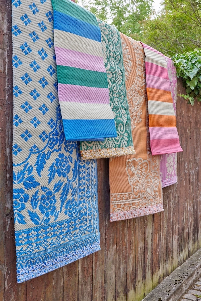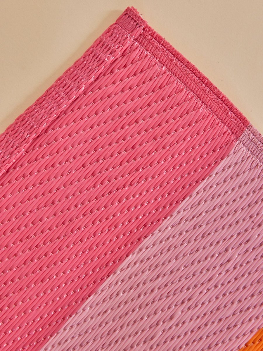 Origineel vloerkleed van gerecycled plastic met roze en oranje strepen. Dit kleed zal je huis doen opfleuren … of je hem nu in de gang, woon- of slaapkamer gebruikt! Ook in de tuin staat ie fantastisch!