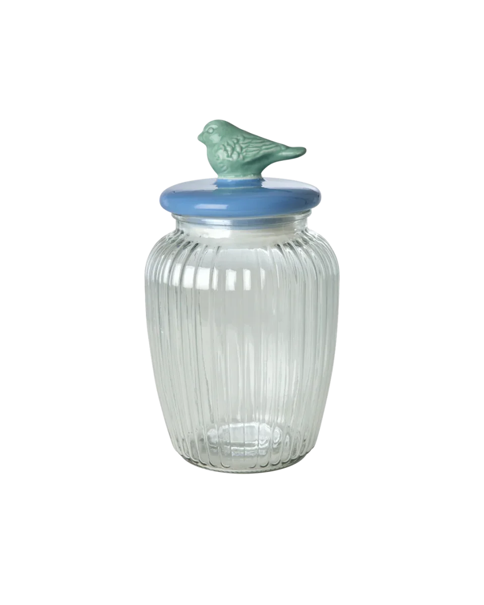 Een grote glazen pot met een blauwe deksel met daarop een schattig vogeltje. De pot ziet er niet alleen leuk uit, maar is ook super praktisch. De sluiting zorgt ervoor dat je koekjes lekker knapperig blijven. Of het nu koekjes, snoepjes of zelfgemaakte muesli zijn, deze pot geeft kleur en vrolijkheid aan je keuken.