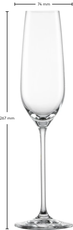 Het Fortissimo champagneglas heeft een hoge, slanke kelk met een inhoud van 240 ml en een diameter van 7,4 cm. De smalle vorm helpt om de bubbels langer vast te houden en de aroma’s geleidelijk vrij te laten komen. De taps toelopende opening concentreert de geur en zorgt ervoor dat de verfijnde tonen van de champagne op een elegante manier tot de neus en mond komen.