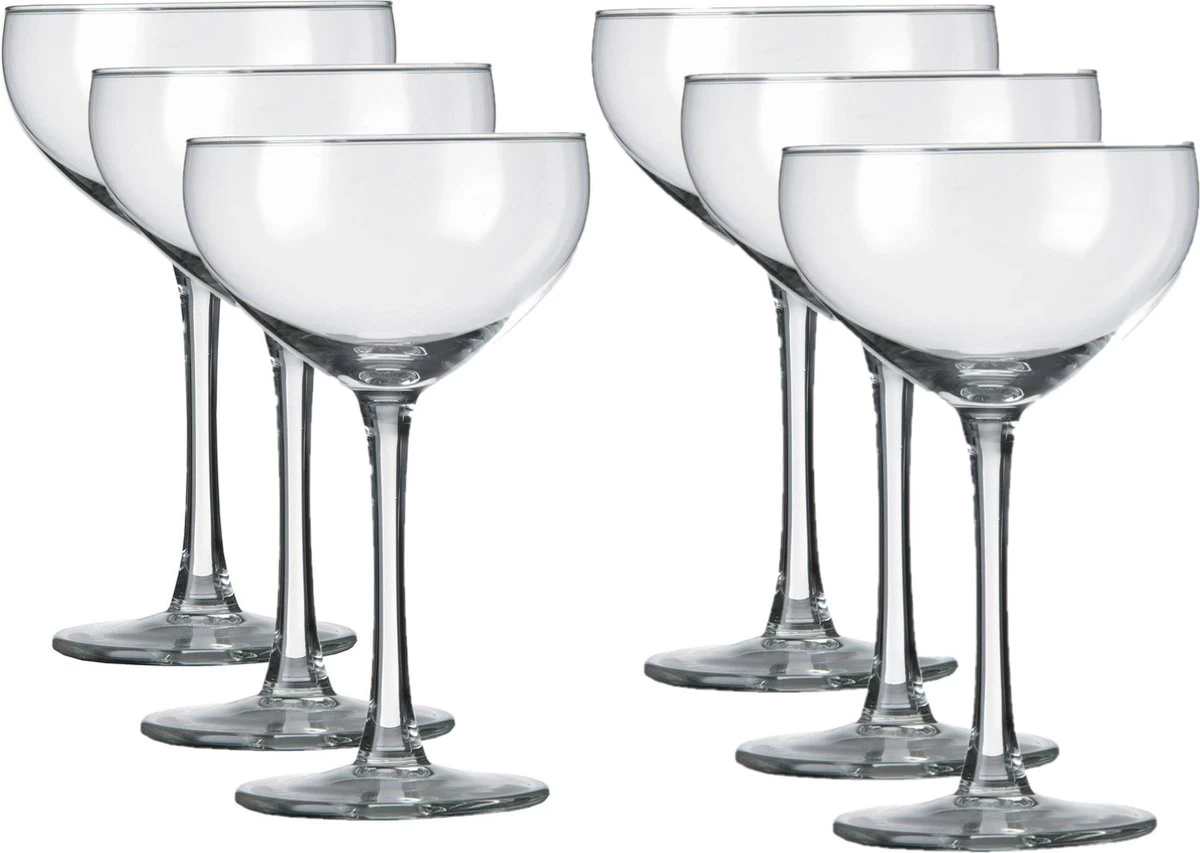 Set van 12x stuks champagneglazen/coupe transparant. Inhoud: 240 ml (24 cl). Materiaal: glas. Doorsnede glas: 9 cm. Hoogte glas: 15 cm. Diameter boven: 9 cm. Diameter midden: 9 cm. Diameter onder: 7 cm. Verpakking: luxe doos. Geschikt voor: vaatwasser. Geschikte dranken: champagne. Zoek voor meer glazen in deze serie op: Specials.