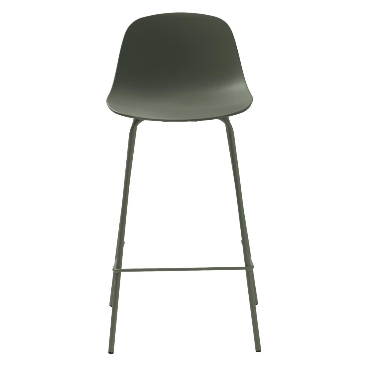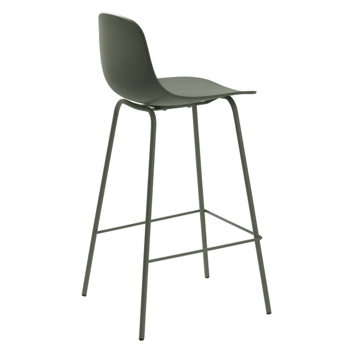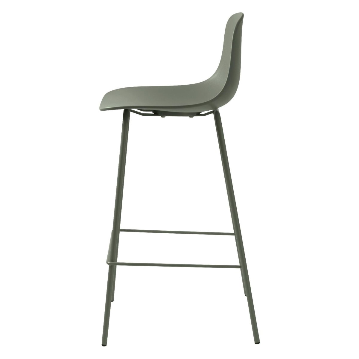 Een set van twee moderne barstoelen met rugleuning in een trendy olijfgroene kleur geeft je keuken, kookeiland of thuisbar direct een stijlvolle upgrade. De slanke metalen poten met geïntegreerde voetsteun zorgen voor een stabiele basis en een ontspannen zithouding, terwijl de ergonomisch gevormde kunststof zitting met lichte ronding in de rug extra zitcomfort biedt. Door de neutrale, warme groentint laat deze barstoel zich moeiteloos combineren met een industrieel, modern of Scandinavisch interieur. Perfect als barkruk aan het aanrecht, de bar of een hoge eettafel. Met een praktische zithoogte van 67 cm sluiten deze barstoelen uitstekend aan op de meeste keukenbladen en bartafels.