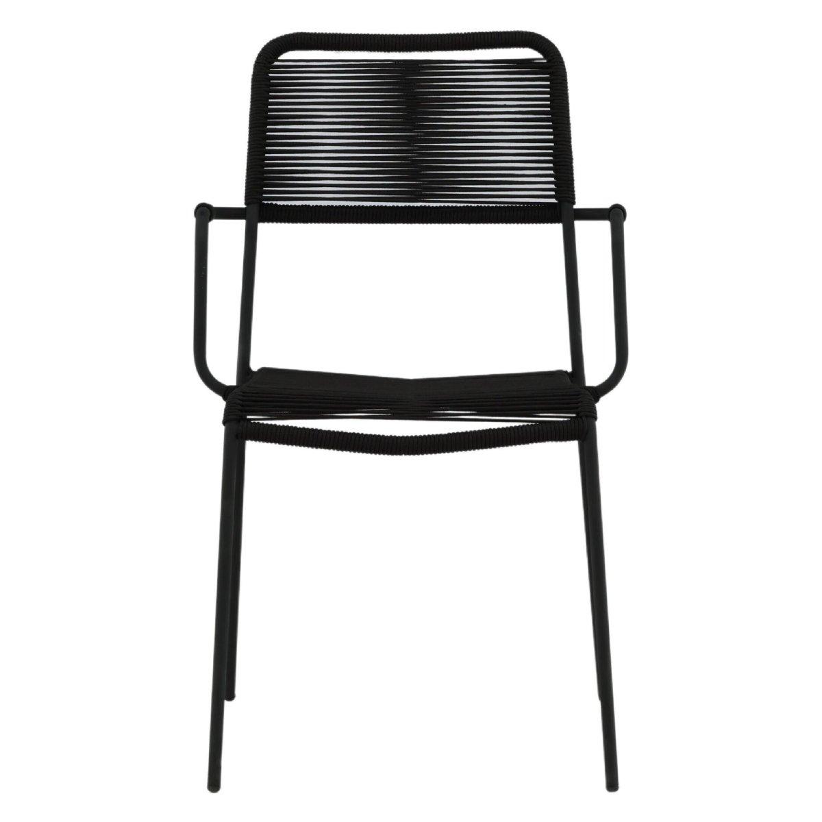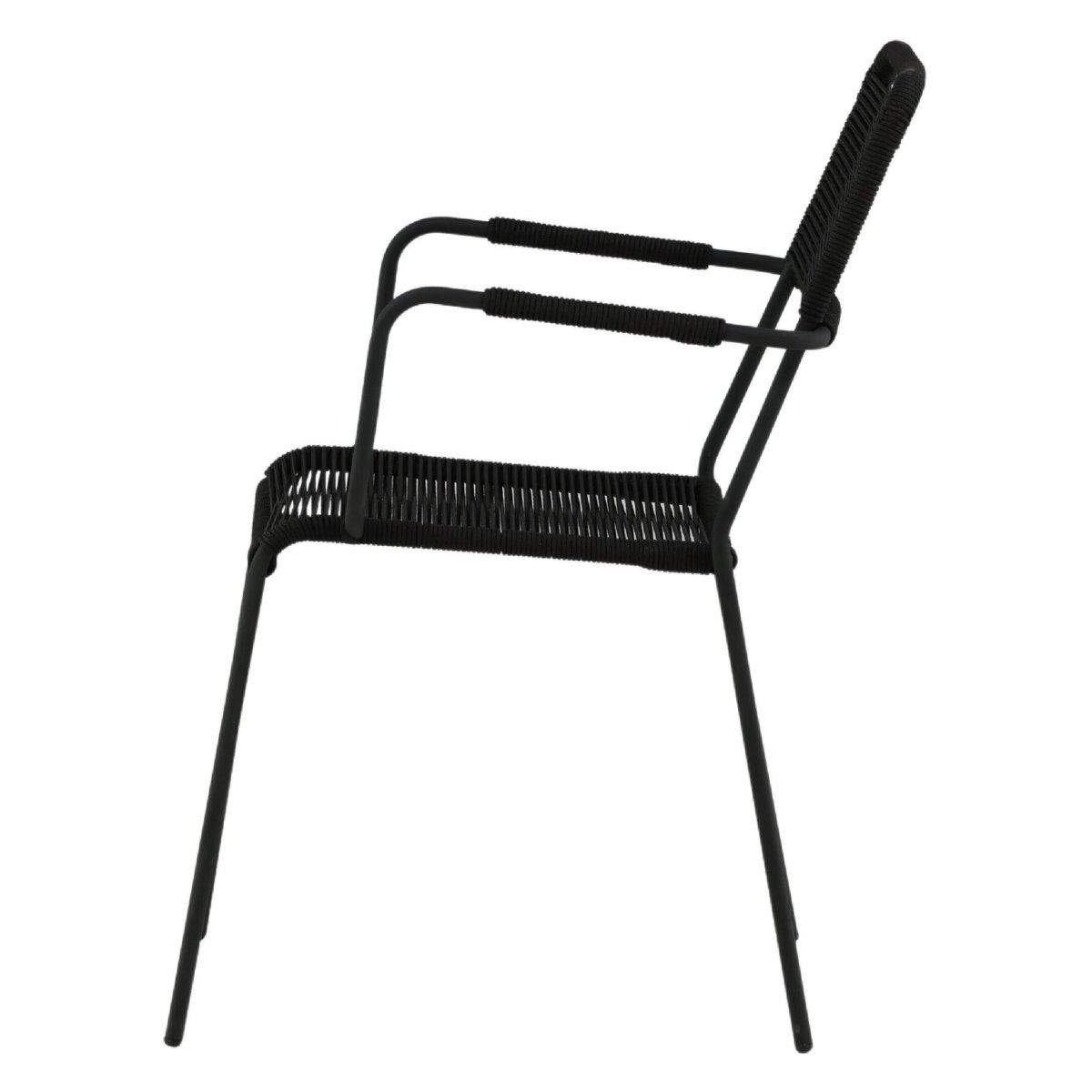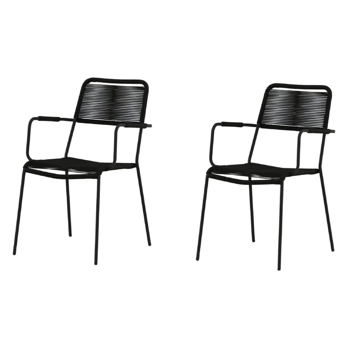 Geniet van stijlvol en modern buiten dineren met deze set van 2 stapelbare dining tuinstoelen met armleuning. De volledig zwarte buitenstoelen combineren een sterk stalen onderstel met een zitting en rugleuning van duurzaam rope in touwlook. Dankzij de ergonomische vormgeving, comfortabele armleuningen en tijdloze kleur passen deze design tuinstoelen perfect op elk terras, balkon, veranda of in de overkapping. De tuin eetstoelen zijn onderhoudsvriendelijk, weerbestendig behandeld en ideaal als buiten eetkamerstoelen bij een tuintafel. Door het compacte, stapelbare design berg je de stoelen snel en ruimtebesparend op, terwijl het solide frame zorgt voor hoge stabiliteit, zitcomfort en een draagvermogen tot 150 kg.