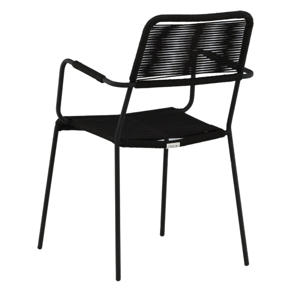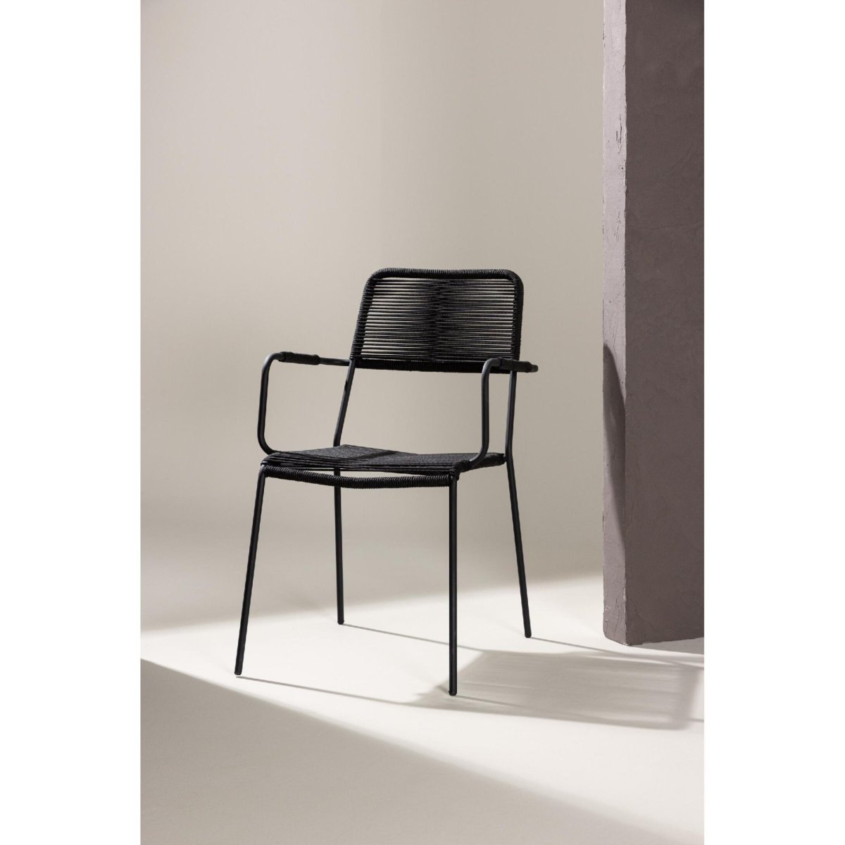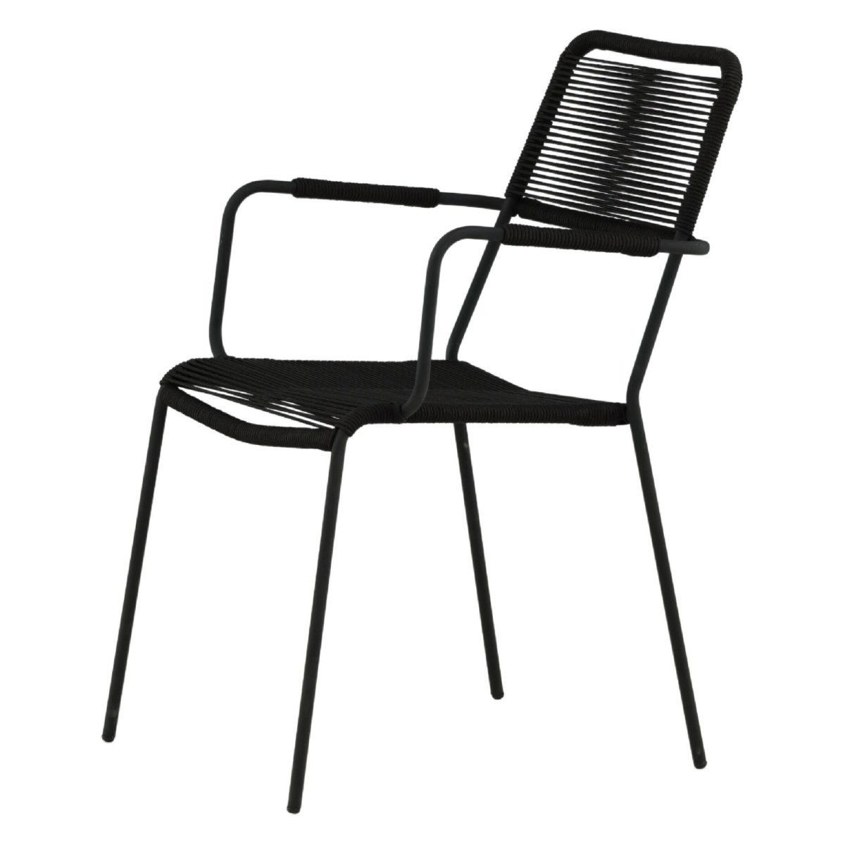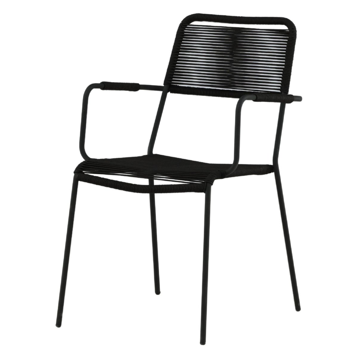 Geniet van stijlvol en modern buiten dineren met deze set van 2 stapelbare dining tuinstoelen met armleuning. De volledig zwarte buitenstoelen combineren een sterk stalen onderstel met een zitting en rugleuning van duurzaam rope in touwlook. Dankzij de ergonomische vormgeving, comfortabele armleuningen en tijdloze kleur passen deze design tuinstoelen perfect op elk terras, balkon, veranda of in de overkapping. De tuin eetstoelen zijn onderhoudsvriendelijk, weerbestendig behandeld en ideaal als buiten eetkamerstoelen bij een tuintafel. Door het compacte, stapelbare design berg je de stoelen snel en ruimtebesparend op, terwijl het solide frame zorgt voor hoge stabiliteit, zitcomfort en een draagvermogen tot 150 kg.