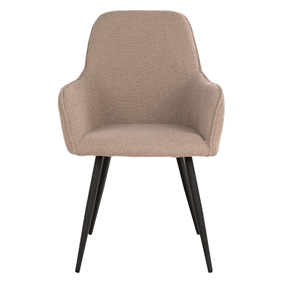 De ranke, zwarte poten geven de stoelen een modern en minimalistisch karakter dat moeiteloos combineert met houten, marmeren of metalen eettafels. Het tijdloze contrast tussen de beige bouclé zitting en het zwarte onderstel oogt chic, waardoor je eethoek een rustige, hoogwaardige uitstraling krijgt. Het slanke silhouet houdt de ruimte licht en open, ideaal in kleinere eetkamers, appartementen of open woonkeukens. Dankzij het stabiele stalen frame zit je stevig, ook wanneer je wat dieper in de zitting schuift. De neutrale kleurstelling sluit perfect aan bij Scandinavische interieurs, minimalistische keukens en warme materialen zoals eiken, walnoot of natuursteen. Zo creëer je eenvoudig een samenhangende, moderne eetkamerlook.