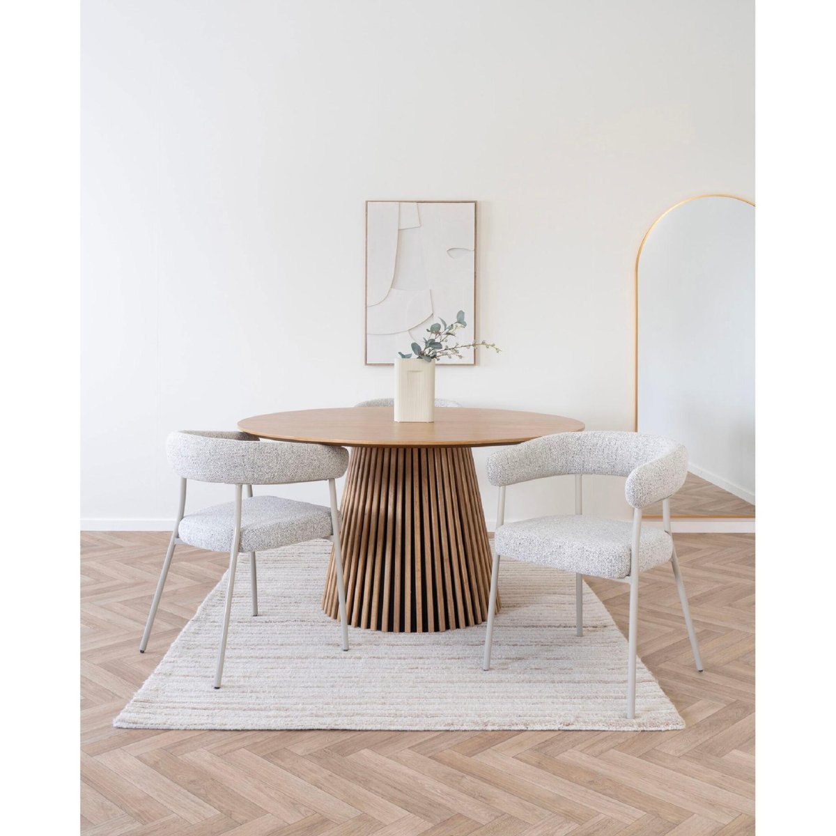 Het ingetogen kleurenpalet in sand beige met grijstint zorgt voor een rustige, tijdloze uitstraling en laat zich makkelijk combineren met natuurlijke materialen zoals hout, natuursteen, beton en zwart staal. Daardoor passen de Lena eetkamerstoelen moeiteloos bij een lichte Scandinavische eettafel, maar ook bij een strakke, industriële of moderne inrichting. De zwarte stalen poten geven een eigentijdse, minimalistische touch en vormen een stijlvol contrast met de zachte stoffen zitting. Het slanke silhouet houdt je eethoek visueel luchtig, wat ideaal is voor kleinere ruimtes of open woonkamers, terwijl de kuip toch uitnodigend oogt. Zo haal je een veelzijdige eetkamerstoel in huis die trends overstijgt en net zo goed tot zijn recht komt in de keuken, eetkamer als in een stijlvolle thuiswerkplek.