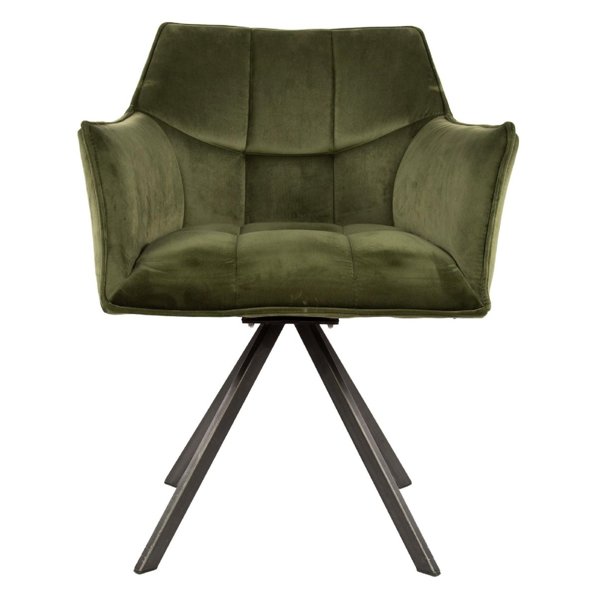 Deze set van twee groene velvet eetkamerstoelen met armleuning geeft je eethoek direct een luxe, warme en moderne uitstraling. De draaibare kuipstoel combineert een comfortabel, zacht gevoerd zitvlak met stevige armleuningen en een elegante groene velours bekleding. Dankzij de hoogwaardige nosag vering in de zitting zit je urenlang prettig aan tafel, of je nu uitgebreid dineert, thuiswerkt of gezellig borrelt. Het metalen onderstel zorgt voor optimale stabiliteit en een stoere, eigentijdse look. Deze draaibare velvet eetkamerstoelen passen perfect in een modern, industrieel, Scandinavisch of hotel chique interieur. De stoelen worden geleverd per set van 2 stuks, de genoemde prijs geldt per stuk.