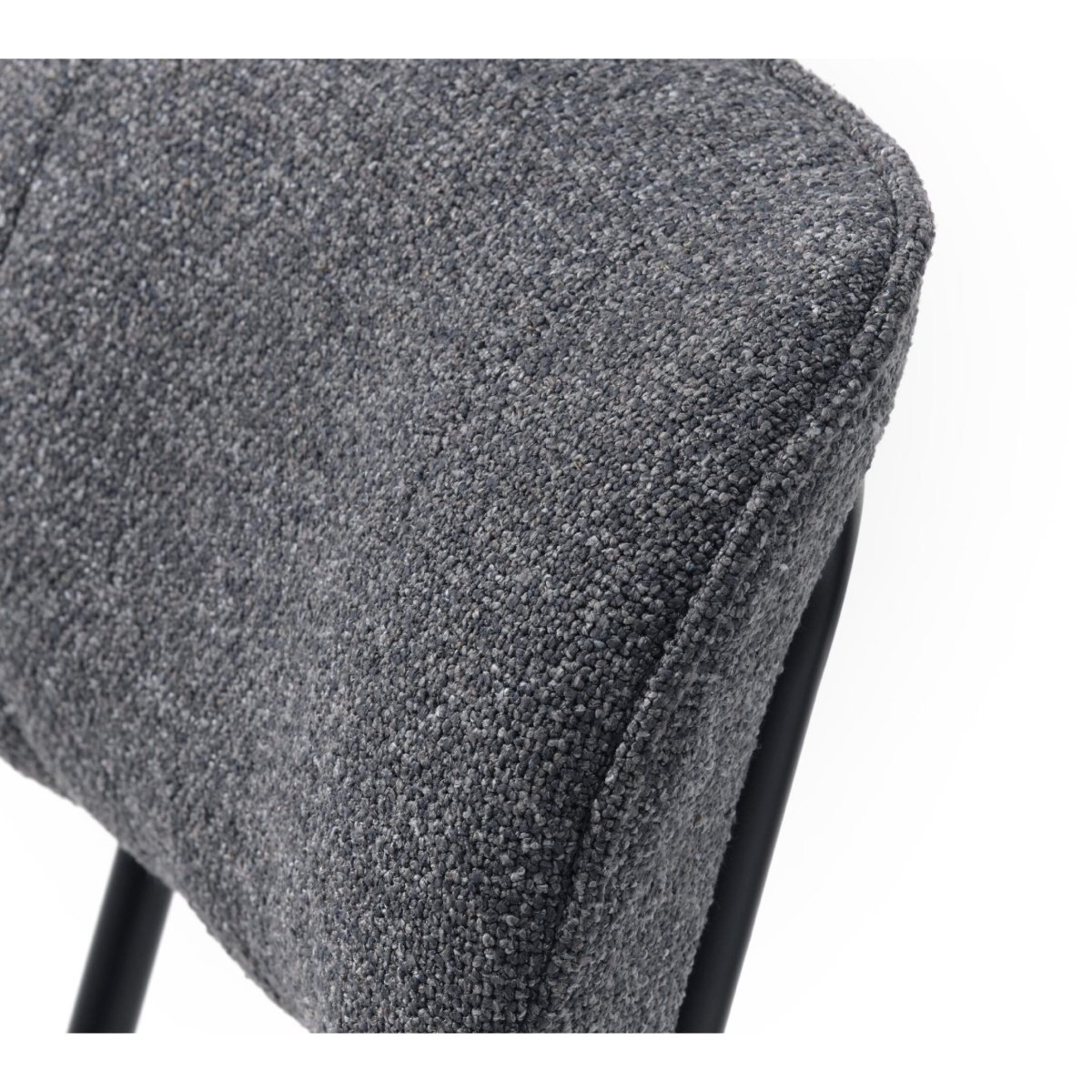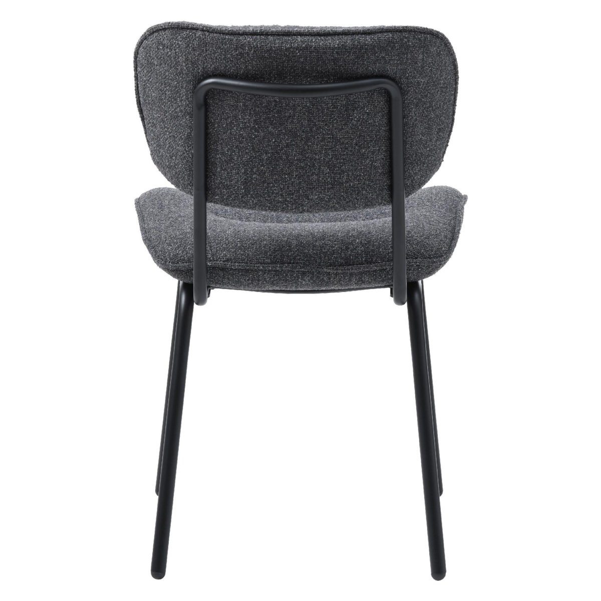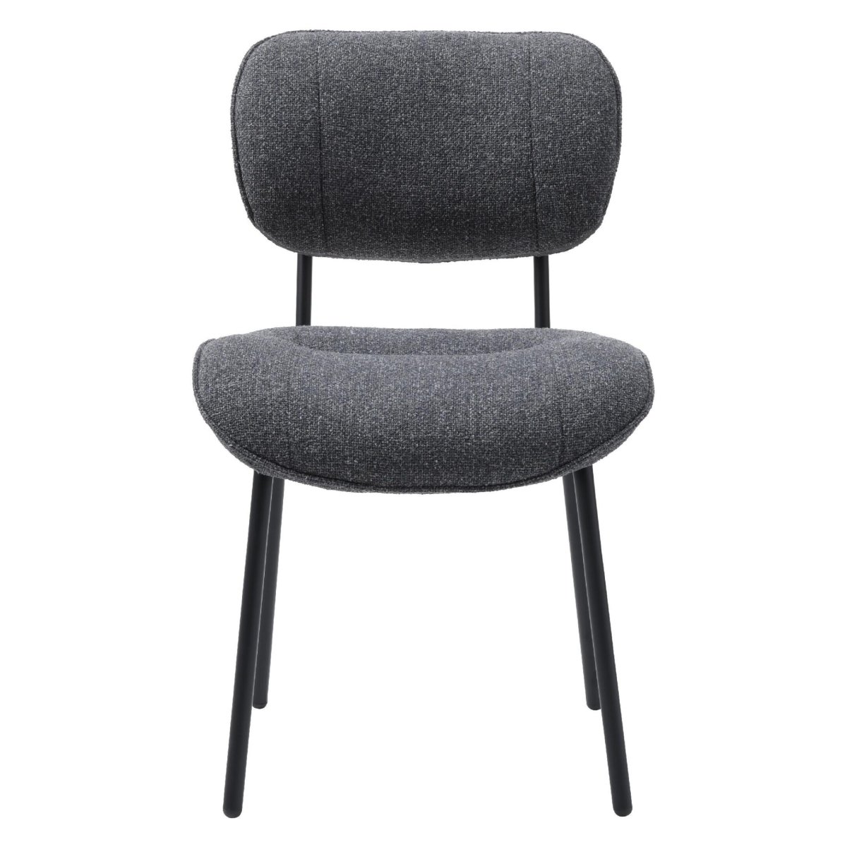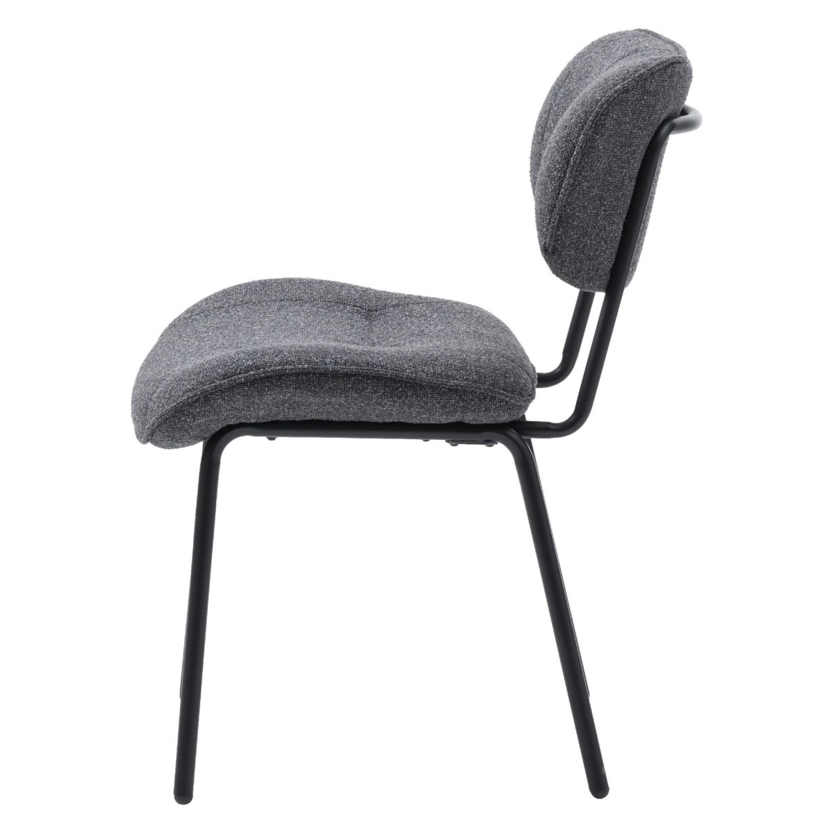 Een set van twee eigentijdse eetkamerstoelen met donkergrijze bouclé bekleding en een slank zwart metalen onderstel. De zachte, dik gewatteerde zitting en rugleuning zorgen voor direct zitcomfort, terwijl de afgeronde vormen en minimalistische lijnen je eethoek een moderne, Scandinavische look geven. De sterke, slijtvaste stof is perfect voor dagelijks gebruik, en de stabiele stalen poten bieden een stevige, betrouwbare zit. Ideaal als eetkamerstoel, keukenstoel of design stoel in de eetkamer, woonkeuken of vergaderruimte. Makkelijk te combineren met uiteenlopende eettafels en passend bij diverse interieurstijlen, van modern en Scandinavisch tot minimalistisch en industrieel.