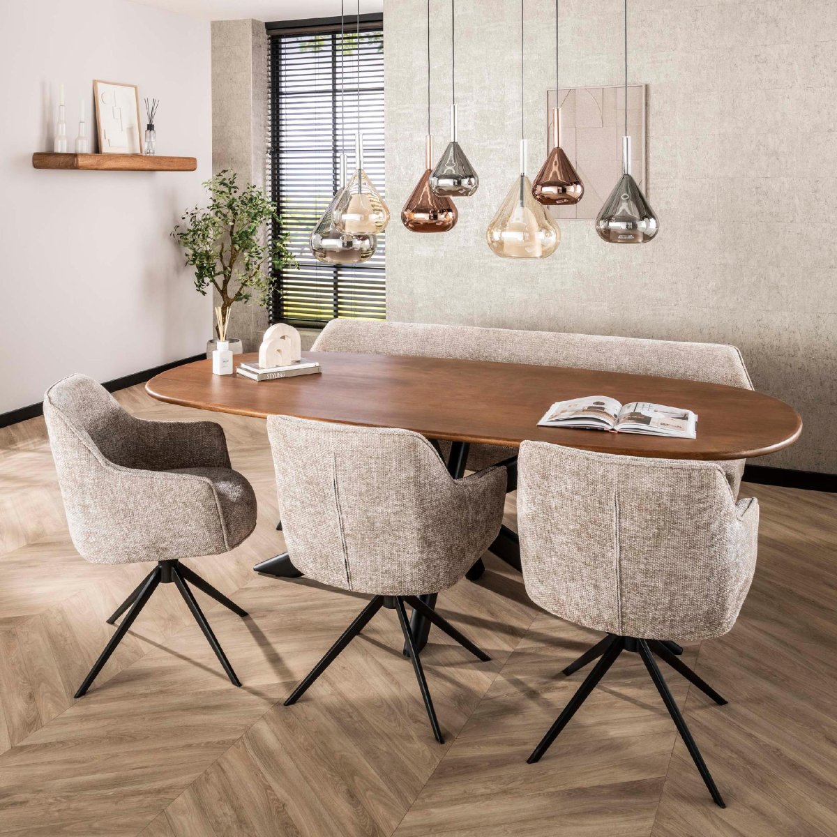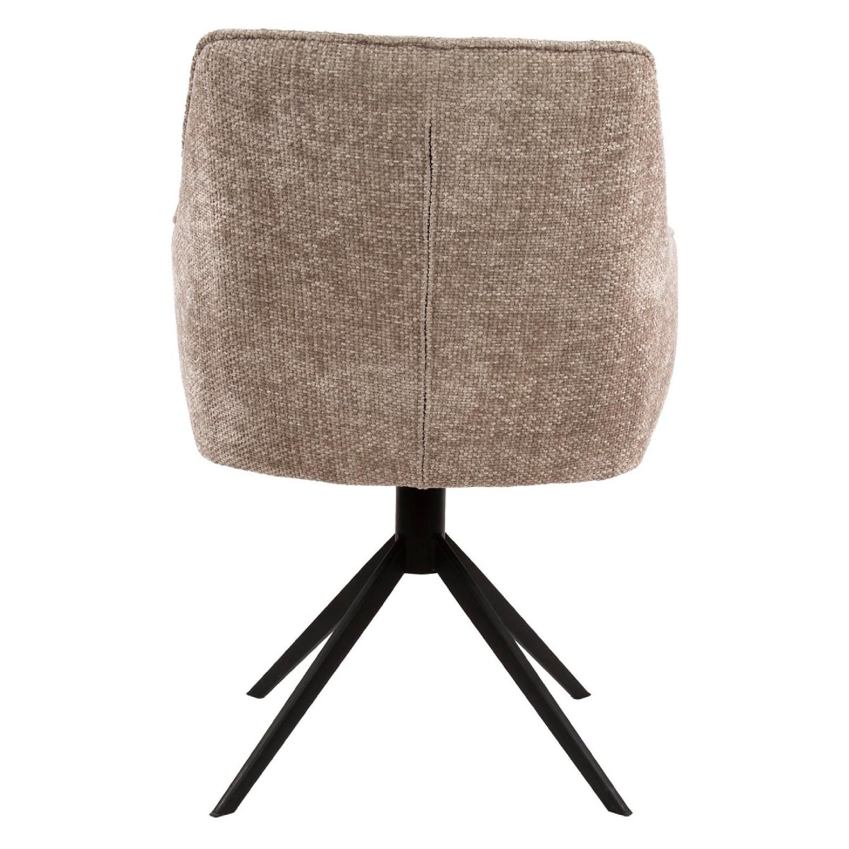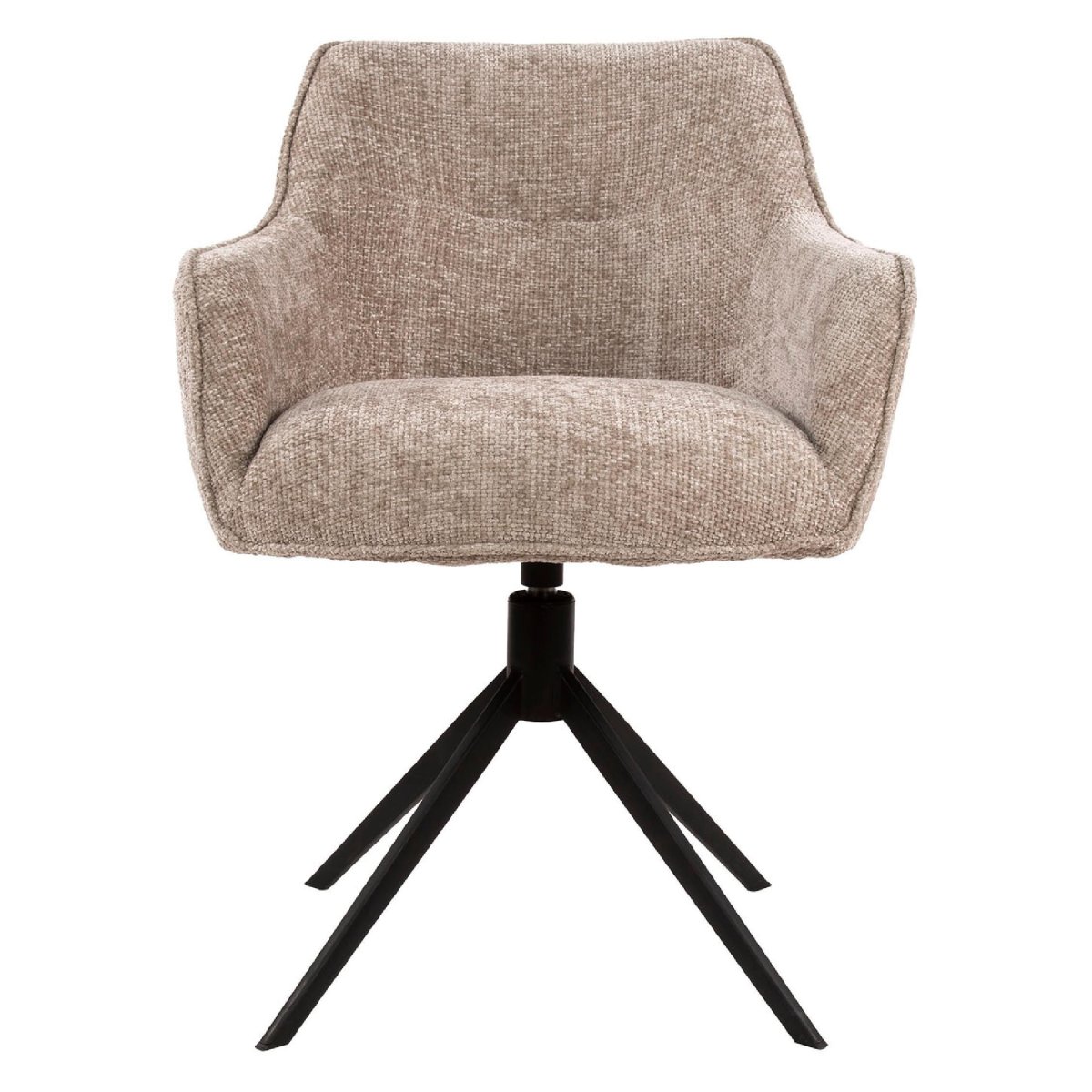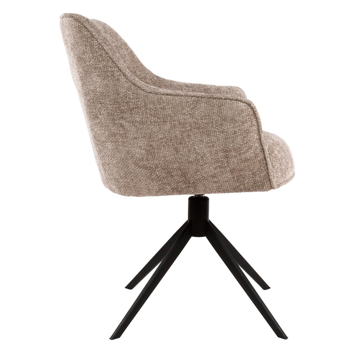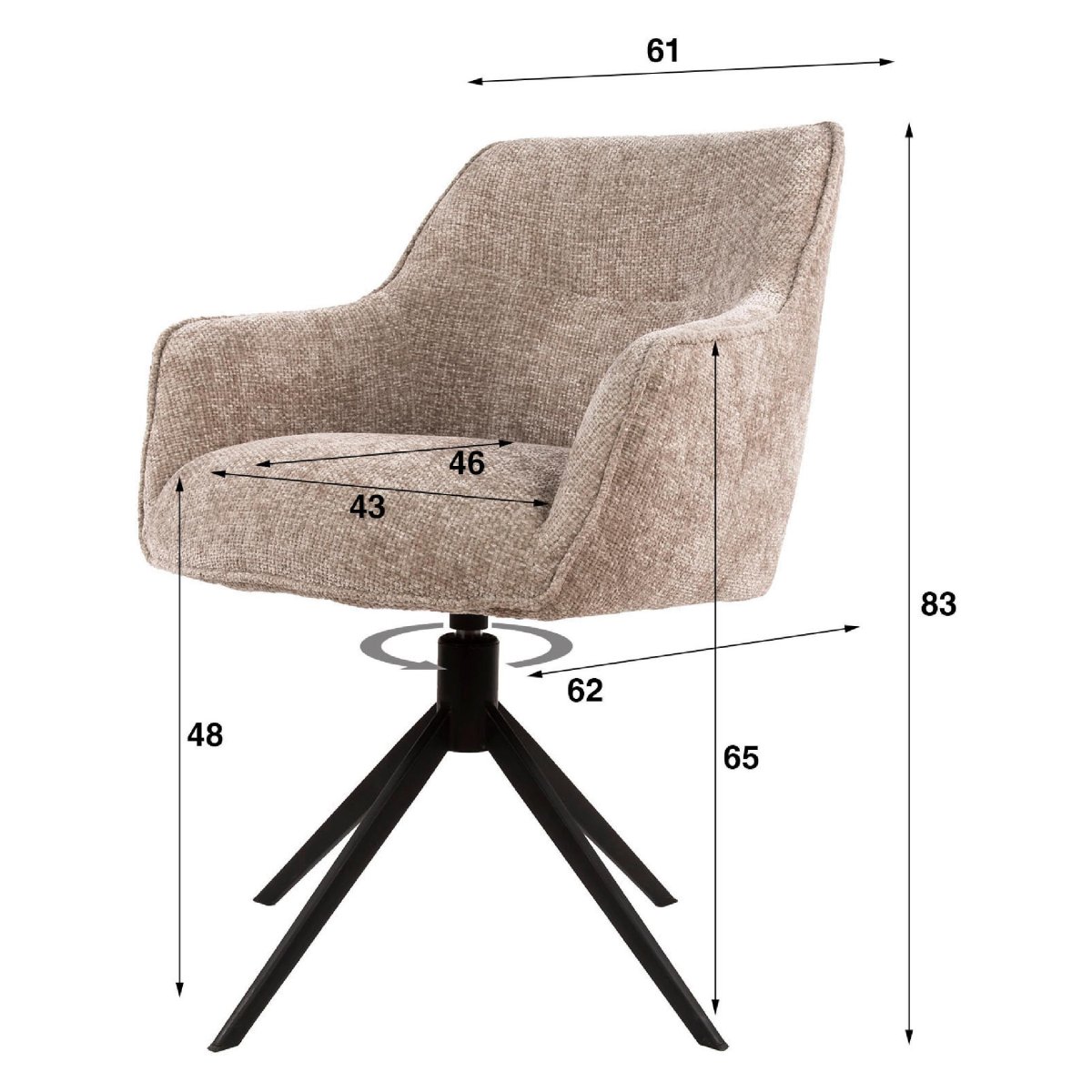 De draaibare zitting maakt instappen, omdraaien en aanschuiven aan de tafel aanzienlijk makkelijker. Je hoeft de stoel niet steeds naar achter te schuiven, wat ideaal is in een compacte eethoek of bij een volle tafelopstelling. Dit voorkomt krassen op de vloer en zorgt voor een rustigere, meer georganiseerde uitstraling in je eetkamer. De zachte zandkleurige stof voelt aangenaam aan en geeft je interieur een warme, uitnodigende sfeer. Dankzij het stevige stalen onderstel met gepoedercoate poten staat de stoel stabiel en slijtvast, zodat je elke dag weer kunt rekenen op betrouwbaar zitcomfort in de eetkamer.