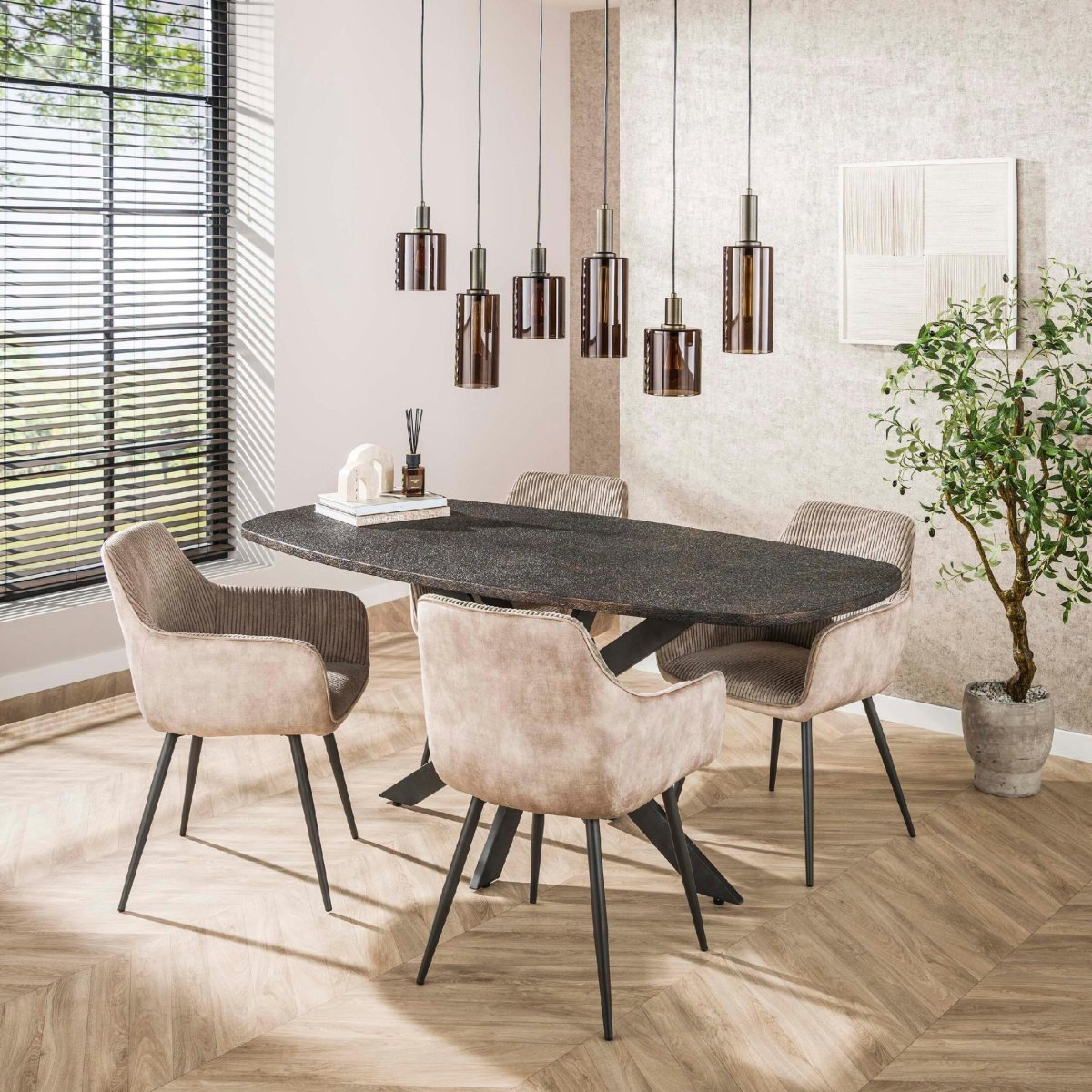 Ben je op zoek naar tijdloze, maar toch trendy eetkamerstoelen, dan is deze Nest of Nora Norel set in rock zand een uitstekende keuze. De neutrale, warme zandkleur past perfect in lichte, minimalistische interieurs én in ruimtes met donkere, industriële accenten. De subtiele ribstructuur van de stof geeft de stoelen extra diepte en karakter, zonder dat ze te nadrukkelijk aanwezig zijn. In combinatie met het strakke zwarte metalen frame ontstaat een moderne, eigentijdse en tegelijk gezellige uitstraling. Hierdoor kun je de stoelen eenvoudig combineren met verschillende soorten eettafels: een robuuste industriële tafel, een houten eettafel, een ronde tafel of een tafel met een centrale poot. Zo creëer je in korte tijd een uitnodigende eethoek waar gezin, familie en vrienden graag aanschuiven.