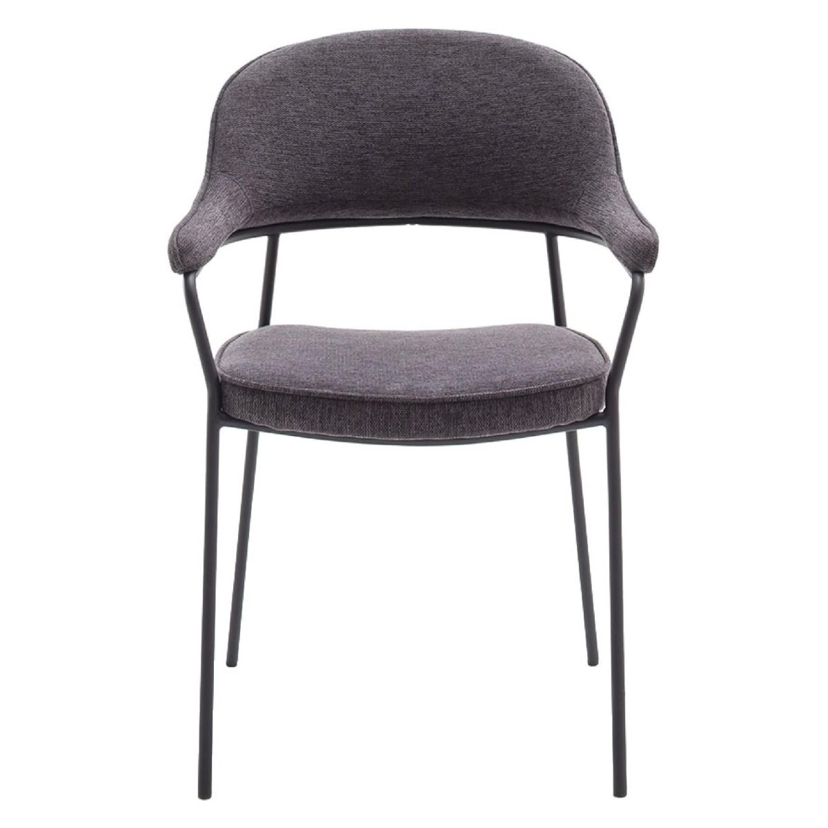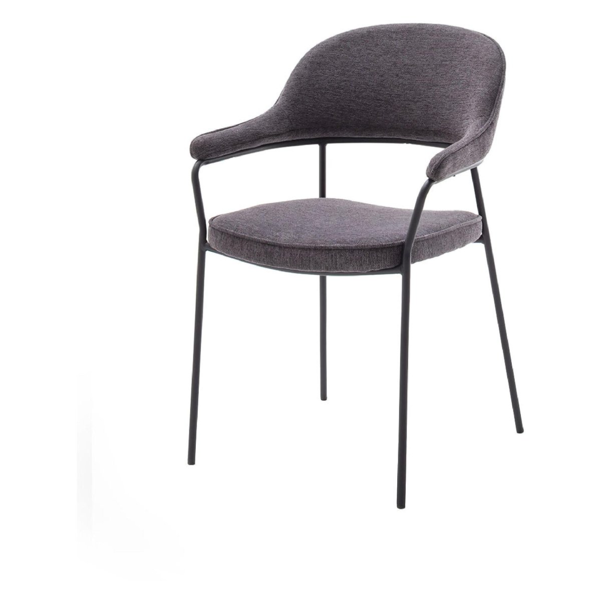 Eetkamerstoelen met armleuningen in donkergrijze chenille, geleverd als praktische set van 2. De comfortabele kuipzitting met ronde rugleuning biedt uitstekende ondersteuning tijdens lange etentjes, gezellige avonden of urenlang werken aan de eettafel. De slanke, zwarte metalen poten geven de stoelen een moderne, tijdloze uitstraling die naadloos past in een Scandinavisch, industrieel of strak modern interieur. Dankzij de slijtvaste, onderhoudsvriendelijke stof en het stabiele stalen onderstel zijn deze eetkamerstoelen ideaal voor dagelijks gebruik, zonder concessies te doen aan design en zitcomfort. Met afmetingen van 85 x 56,5 x 56,5 cm passen de stoelen onder de meeste standaard eettafels en in zowel grote als compacte eethoeken.