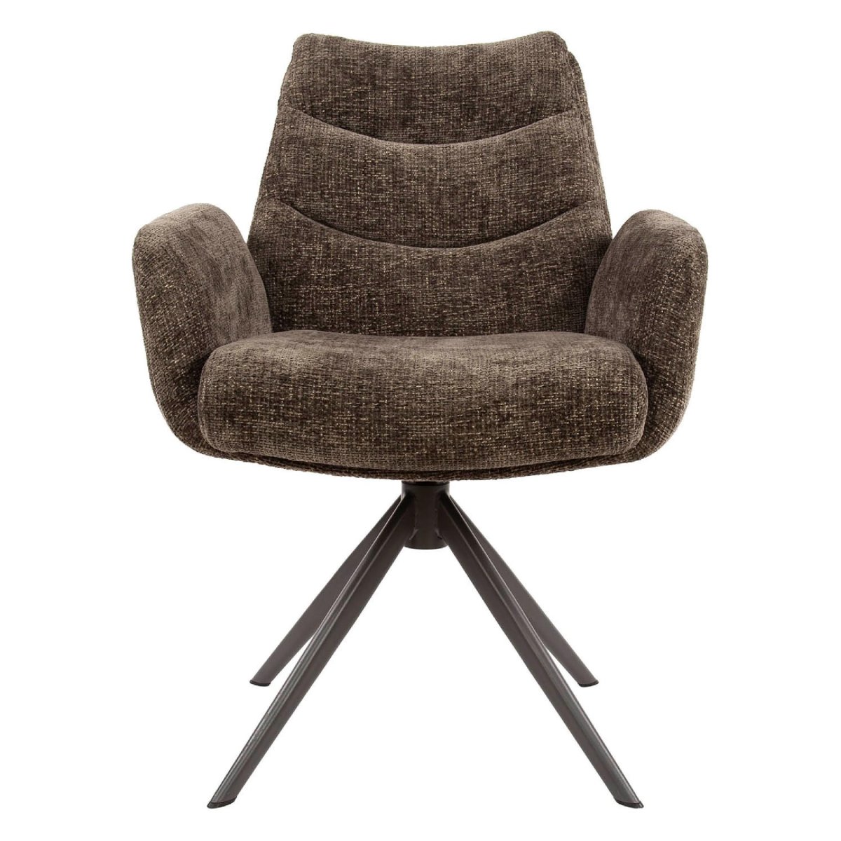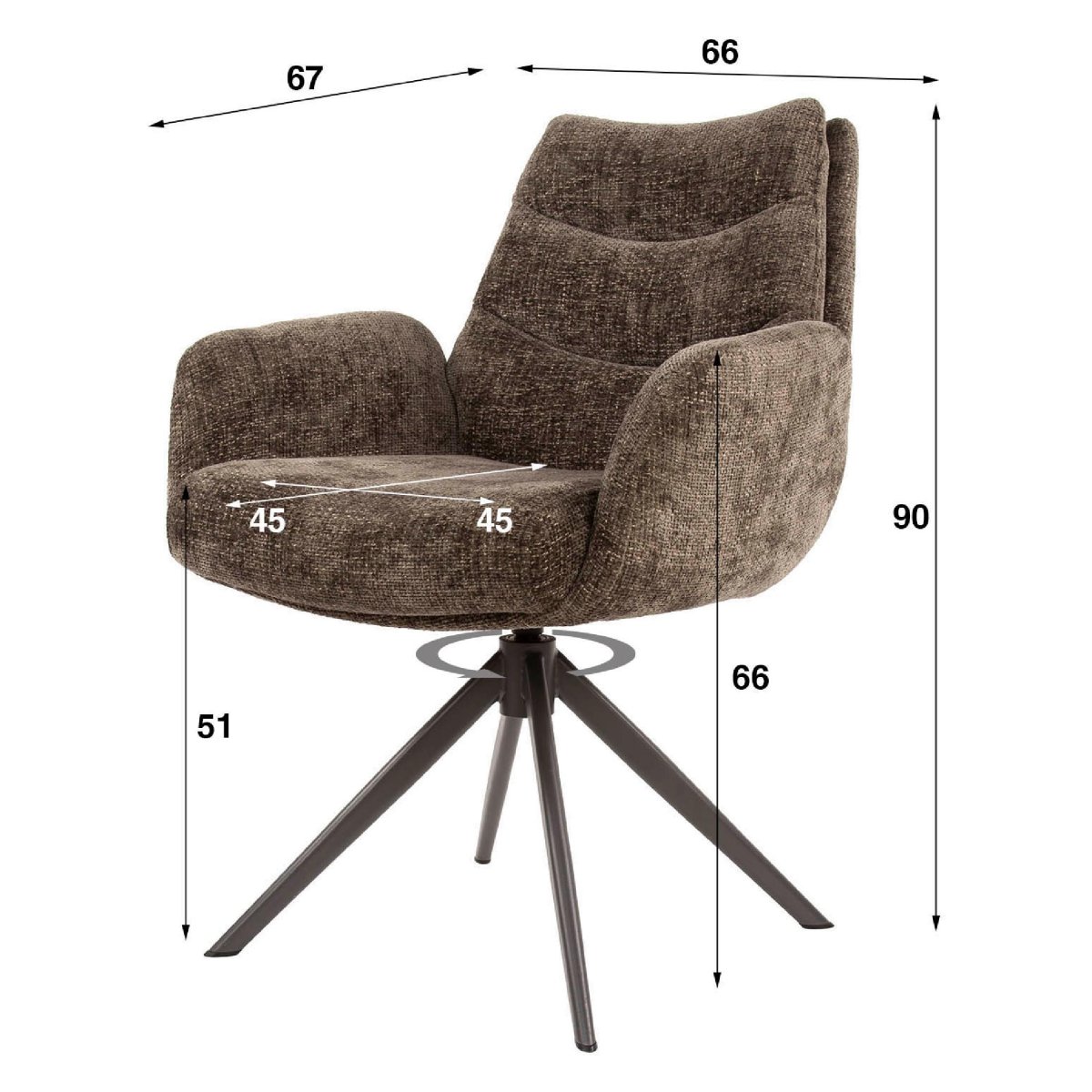 De kleur Hoven taupe en de grof geweven chenille bekleding geven deze eetkamerstoelen een luxe, maar toegankelijke uitstraling. Taupe is een tijdloze, neutrale tint die eenvoudig te combineren is met verschillende interieurstijlen, zoals modern, Scandinavisch, industrieel of landelijk. De zachte, voelbare textuur van de stof voegt warmte en sfeer toe aan de ruimte, terwijl het metalen draaiframe zorgt voor een strak en eigentijds accent.