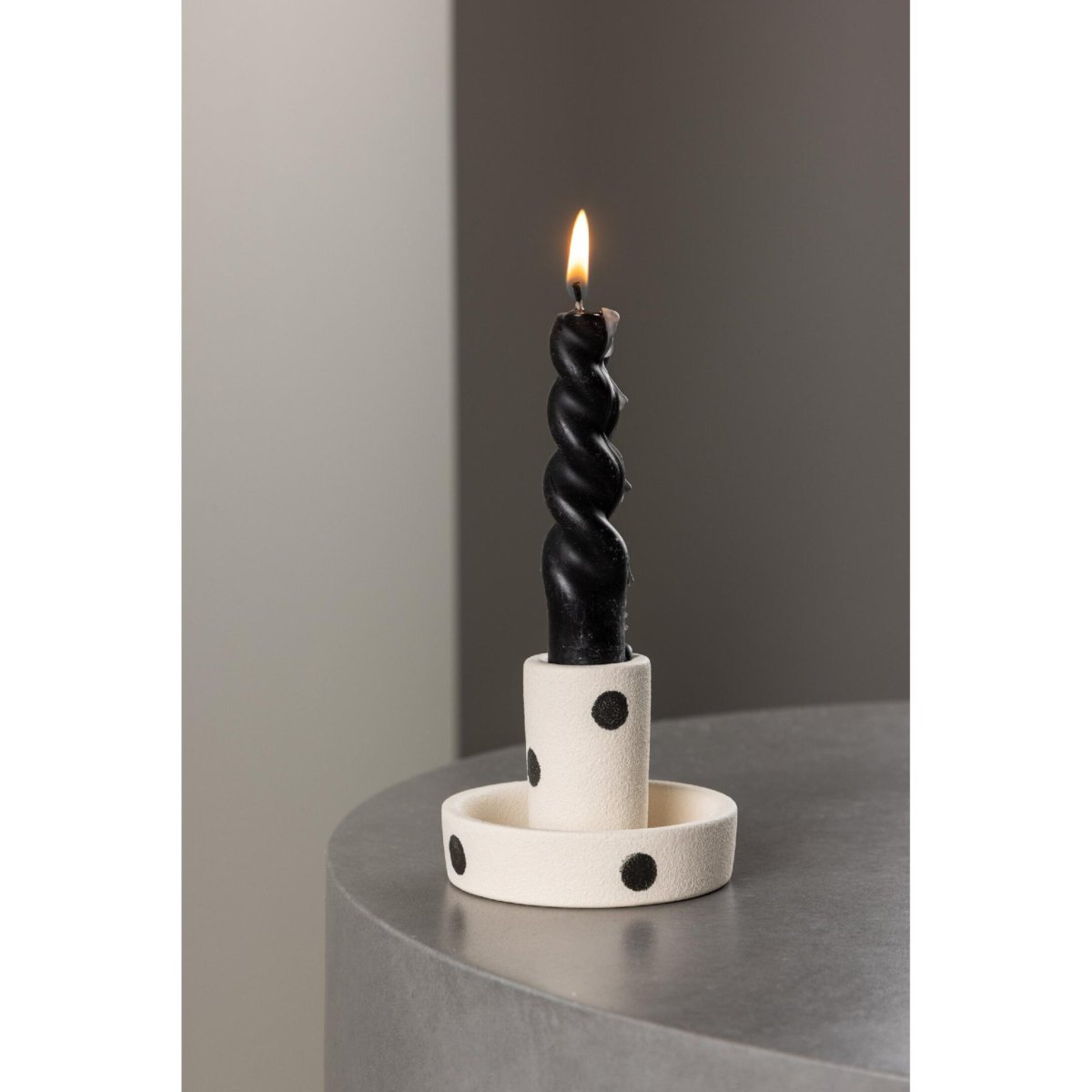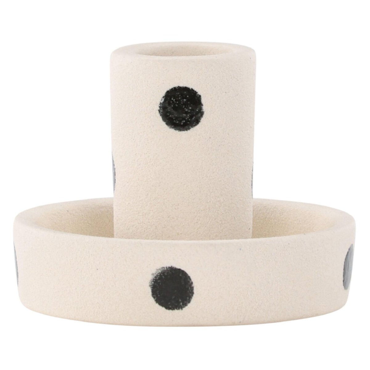 Deze kaarsenstandaards zijn vervaardigd uit kwaliteitskeramiek (steengoed) en combineren een robuust, duurzaam gevoel met een strakke, onderhoudsvriendelijke afwerking. De geglazuurde bovenkant geeft een subtiele glans, beschermt tegen waxspatten en maakt schoonmaken eenvoudig: veeg na gebruik af met een zachte, licht vochtige doek. Dankzij het stevige gewicht staan je kaarsen stabiel en blijft de houder goed op zijn plek, ook bij dagelijks gebruik of regelmatig restylen van je interieur. Het kleurvaste materiaal behoudt zijn heldere witte tint en scherpe stippenprint, waardoor je langdurig kunt genieten van de moderne, tijdloze uitstraling. Ideaal voor dagelijks gebruik, seizoensdecoratie én als stijlvol wooncadeau.