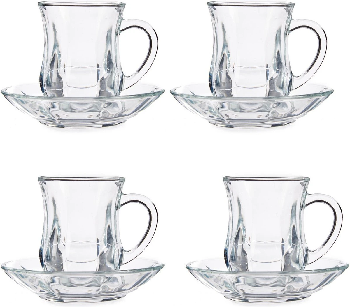 Set van 8x stuks Marokkaanse theeglazen inclusief schotel 125 ml. De glazen zijn perfect voor een heerlijke kopje thee, maar zijn ook geschikt voor koffie of andere warme dranken. Geschikt voor in de vaatwasser. Materiaal: glas. Afmeting per glas: ca. 9 x 6.5 x 8.5 cm.