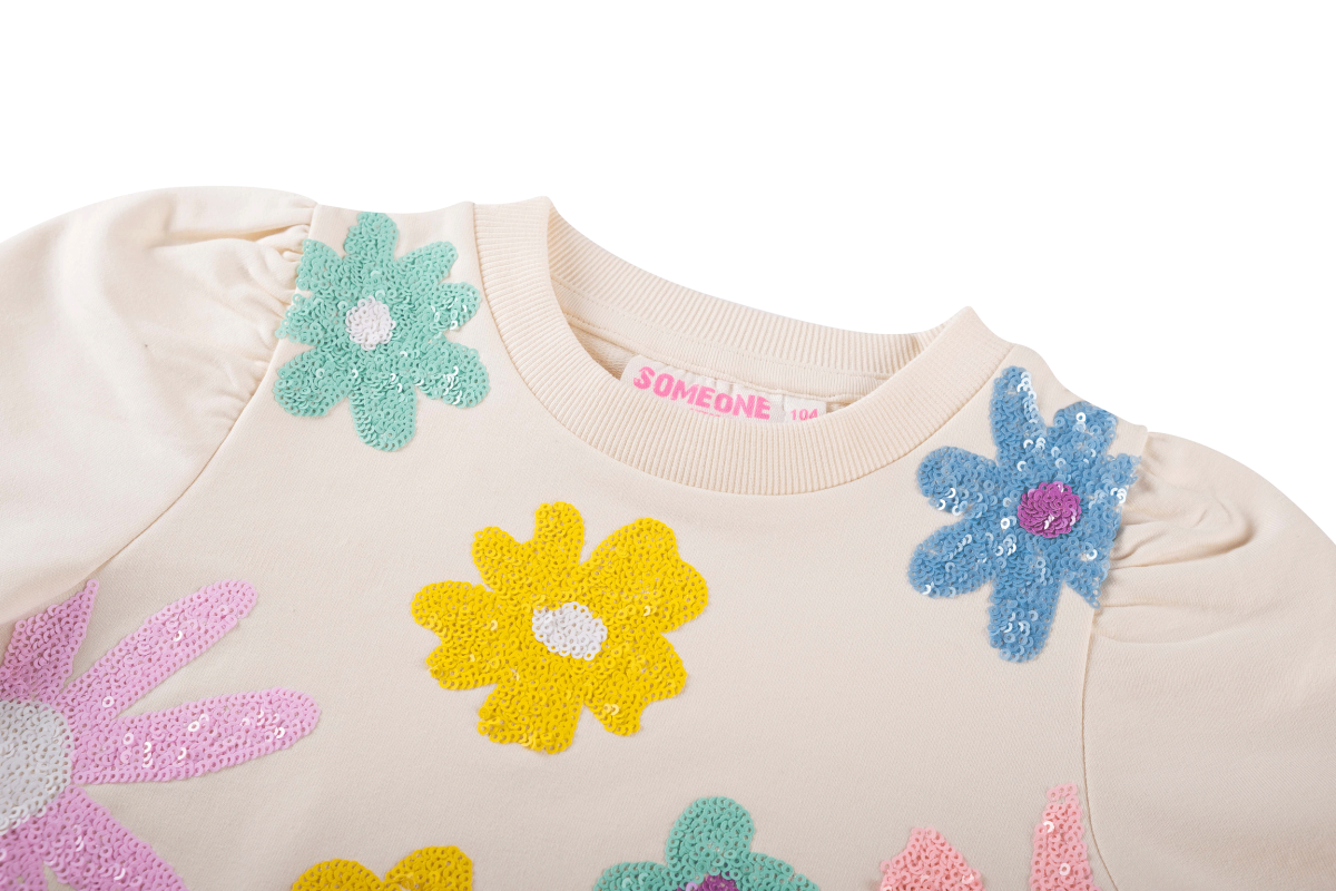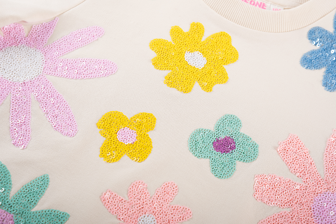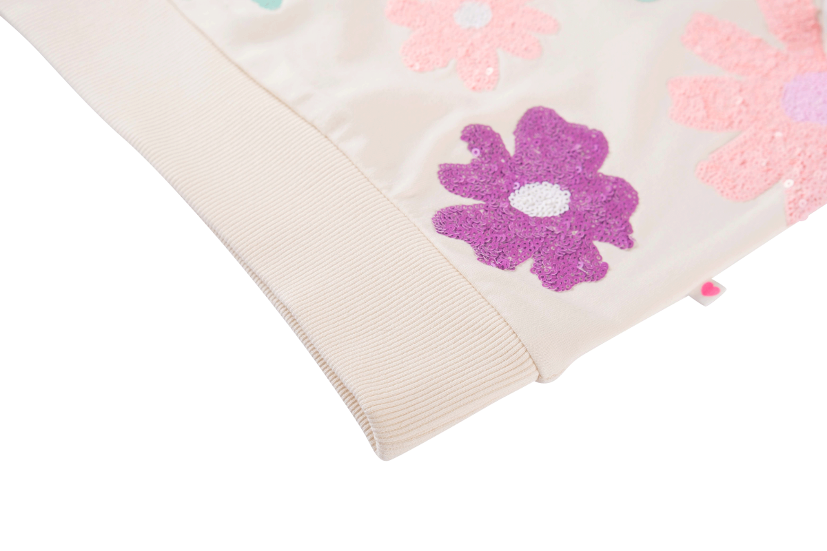 Super leuke sweater van jogging met prachtige bloemen van pailletten.
